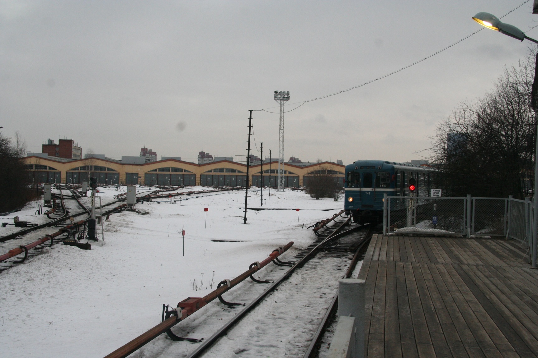 На верхнем фото двумя сообщениями ранее снята соединительная ветка в депо, начинающаяся за перекрёстным съездом (двухпутный тоннель со служебной платформой поворачивает вправо).