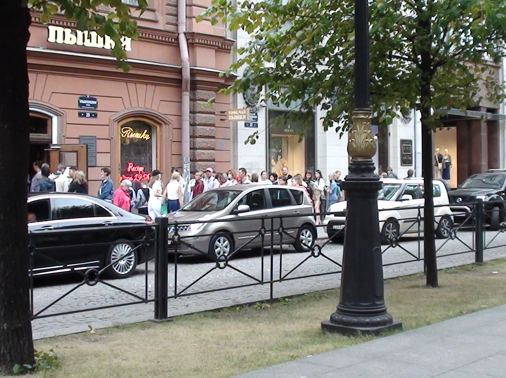 Очереди также, наблюдаются в известную пышечную на Большой Морской. Многие приезжие стараются во что бы то ни было отстоять сколько угодно, чтобы заценить эти пышки именно в этом месте. Хотя на Гостинке по стороне Садовой точно такие же продаются.