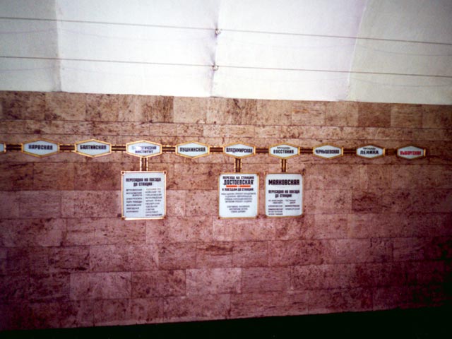 Эта фотография, а также http://www.metrowalks.ru/spb/photo-1-3-1 и http://www.metrowalks.ru/spb/photo-1-3-5 сняты в один и тот же день - 7 января 2004 года. Примерно тогда их и поменяли. На общем плане видно, что на путевой стене в сторону проспекта Ветеранов висели ещё старые указатели, а в сторону Девяткина - уже новые.
