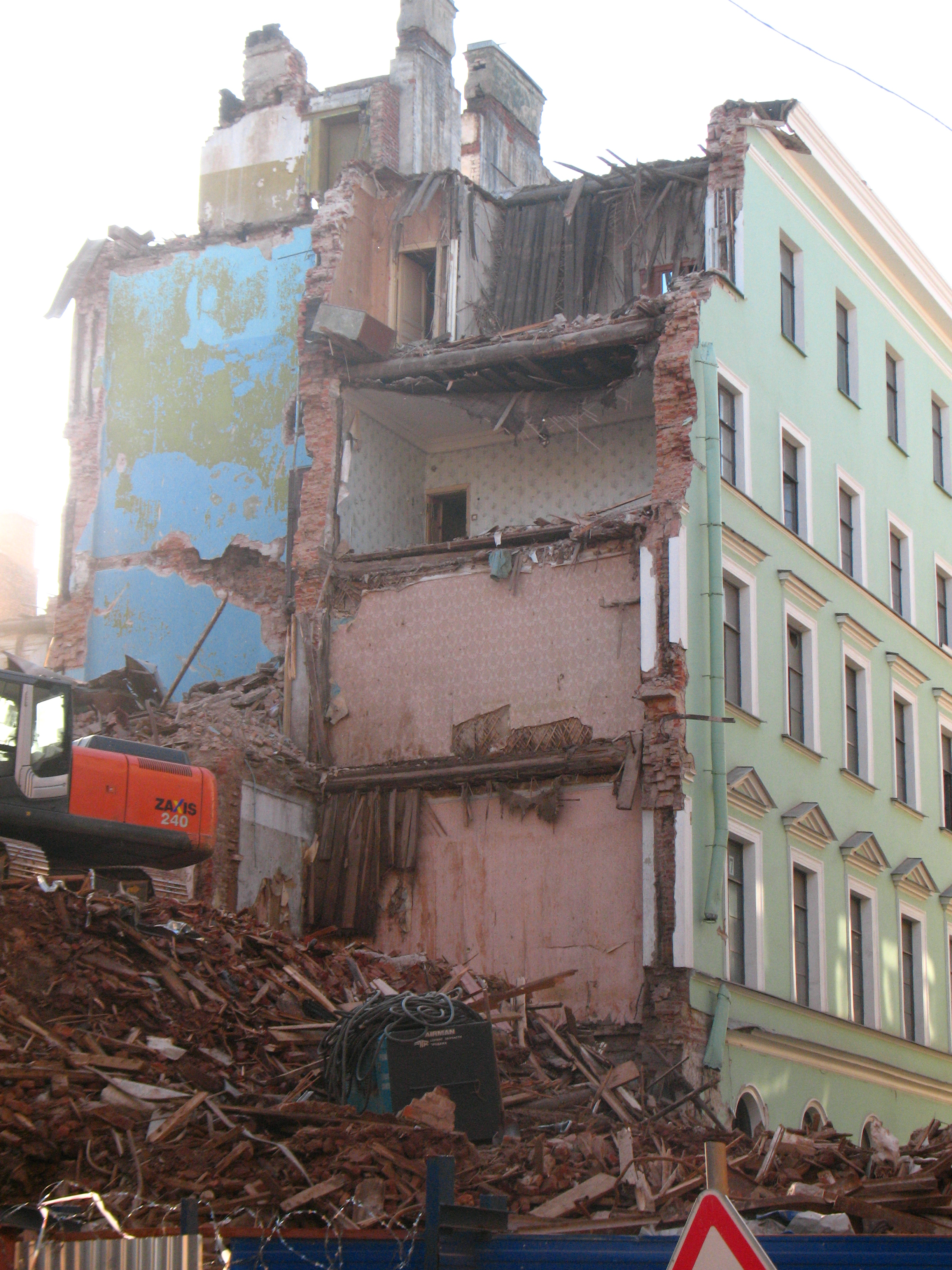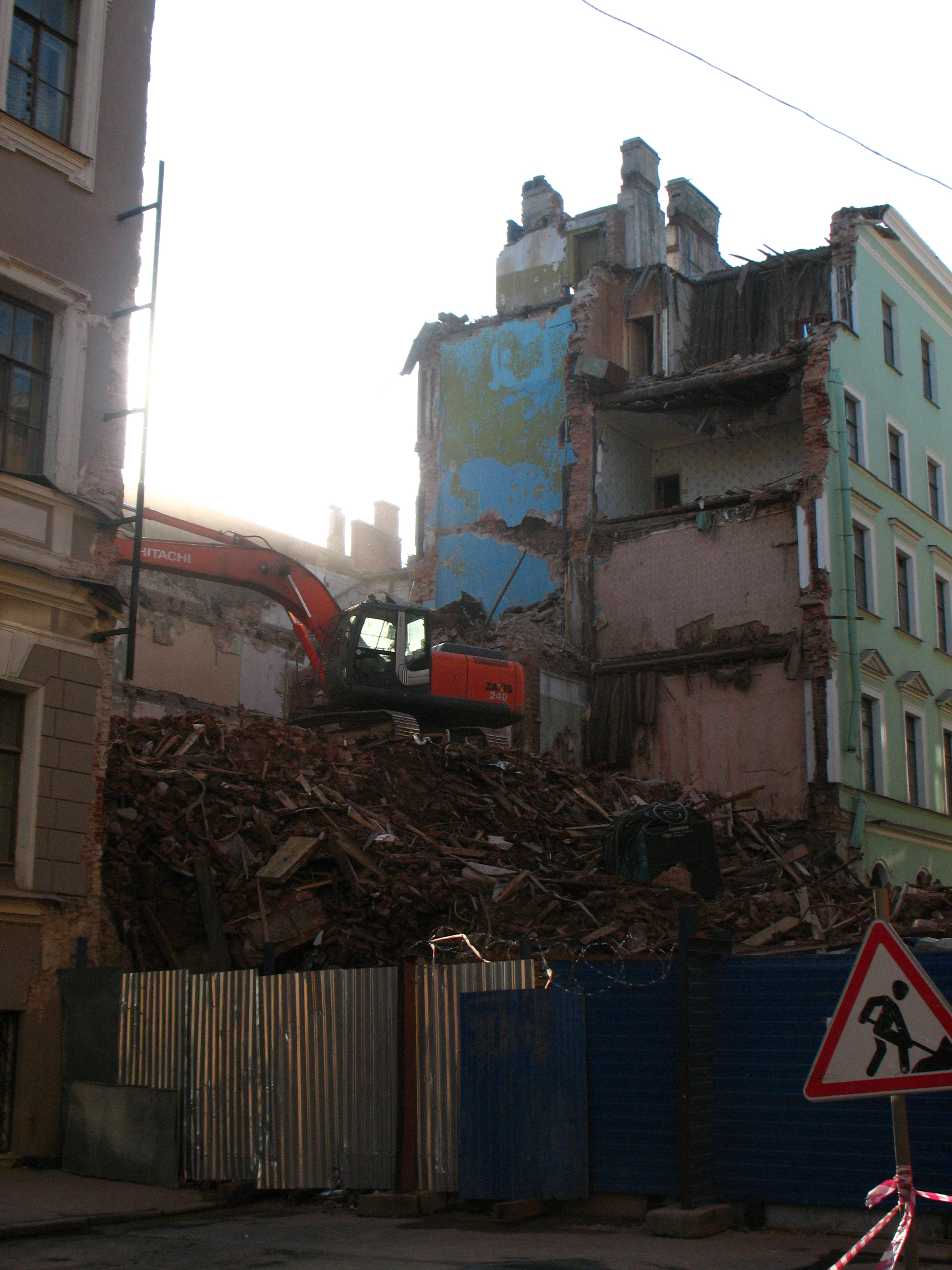 Места там, похоже, мало для одновременной разборки и вывоза. Невские бани на Марата так-же разбирали: сначала всё завалили, а потом эту двухэтажную кучу вывозили.