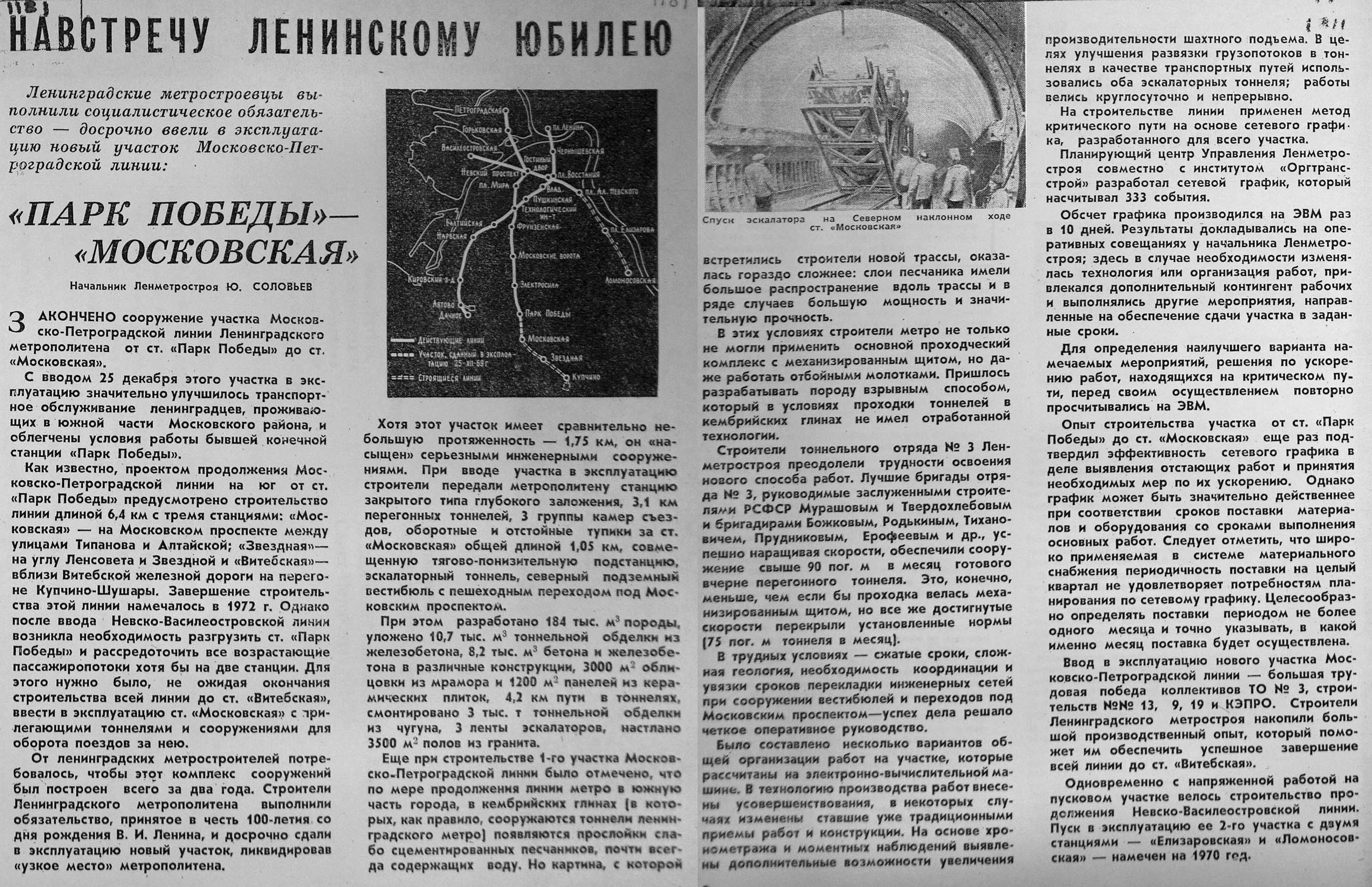 Блок статей, посвящённый открытию станций «Елизаровская» и «Ломоносовская». 1970 год.