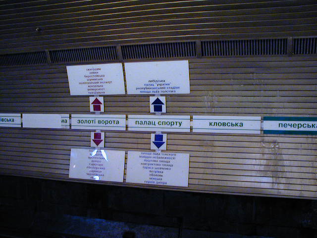 Стрелку на пиктограмму заменить небольшая проблема. Здесь вместо неё — цветовое кодирование. (Указатели выхода в город и основных объектов на поверхности должны немного отличаться от указателей по самому метрополитену.) Номер линии нужен, например, для указателя перехода. Кроме того, он указан в списке станций на путевой стене (опять же, указатели связаны цветом). Не вижу большого смысла дублировать эту информацию на лайтбоксах, висящих непосредственно на платформах.