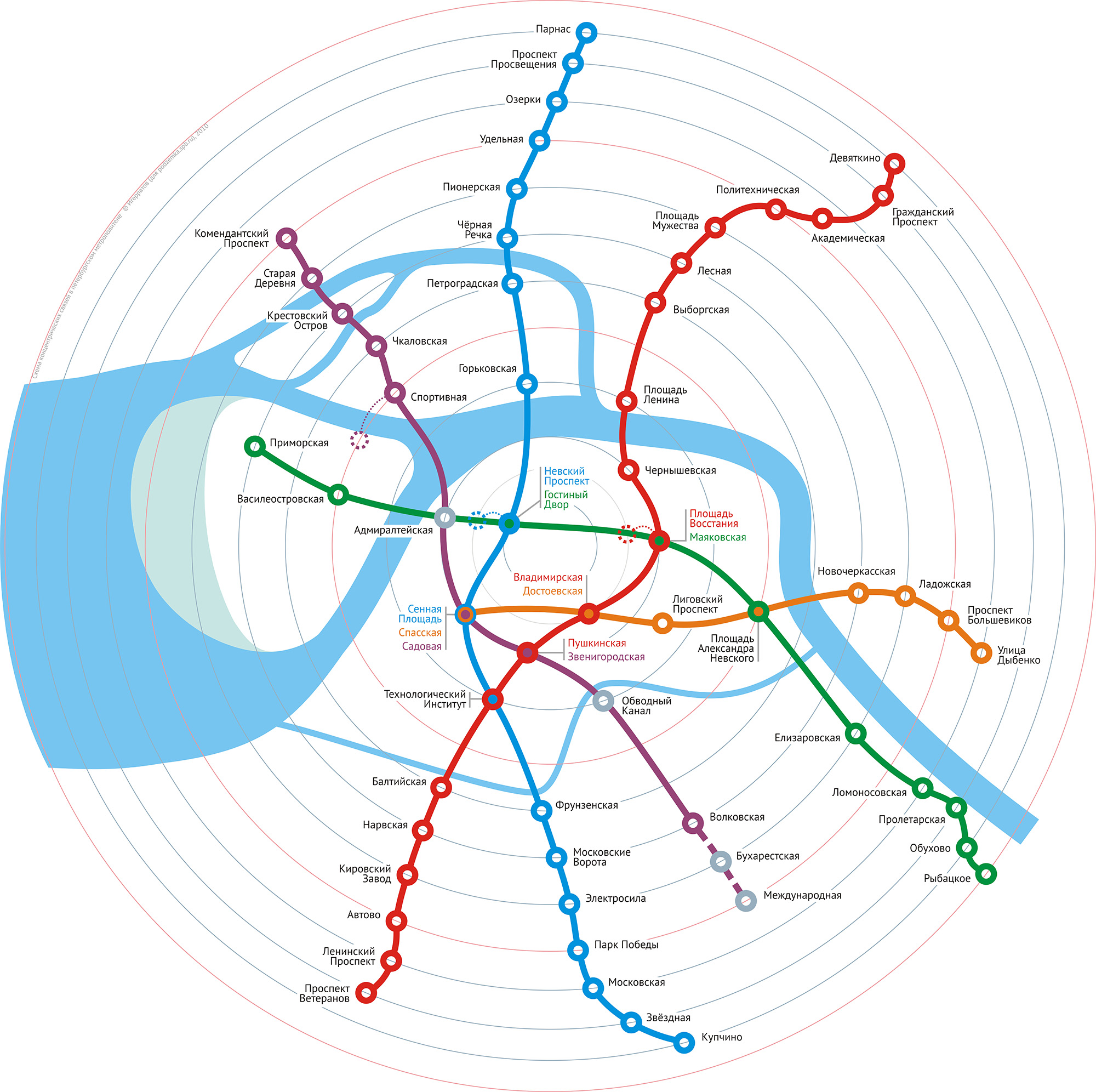 Факт: схема линий петербургского метрополитена сейчас состоит исключительно из диаметров. Многострадальная кольцевая линия так и не построена, несмотря на давние планы её строительства. Примерно до середины 70-х годов предполагалось не только «обвязать» центральные станции кольцом, но и провести хорды на севере и юге города. Связать их в «большое кольцо» не даст, в том числе, необходимость пересекать акваторию Финского залива.