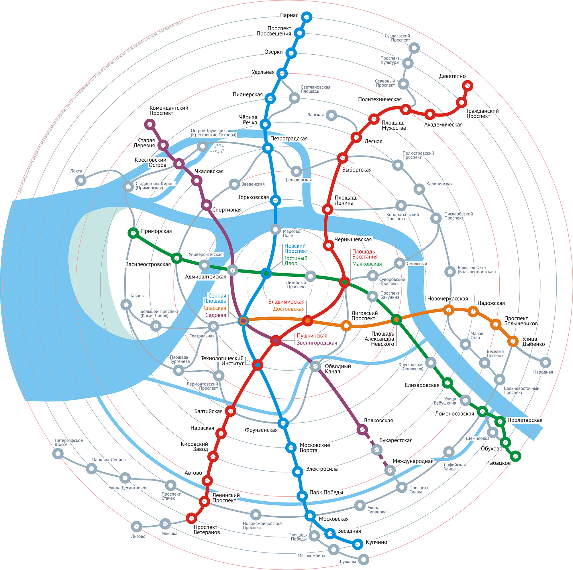 Зато появляется возможность определить тяготение станций к тем или иным дугам и, исходя из расположения сетки улиц, уточнить их размещение на схеме. Так, например, можно сместить наружу станции «Политехническая» и «Академическая»; определить тяготение «Елизаровской» к внутреннему кольцу; «вернуть на место» «Купчино» и «Обухово»; ввести дополнительное кольцо, на котором расположены Владимирская площадь, выходы «Маяковской» и «Гостинного Двора», упоминавшаяся в старых планах станция на углу Литейного проспекта и улицы Некрасова.