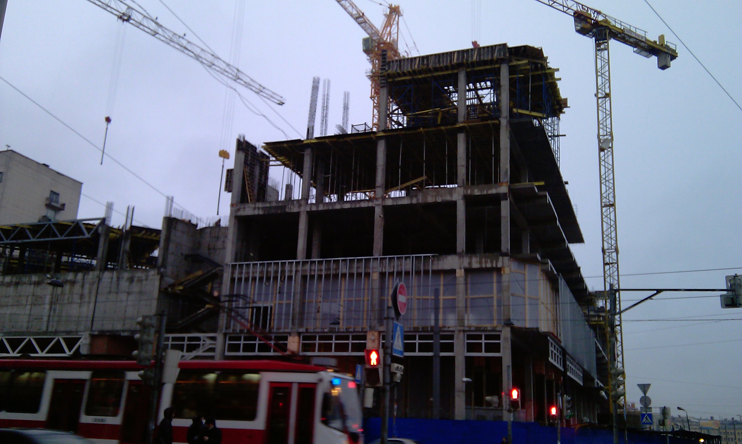 10 ноября на угол здания смонтировали некую металлоконструкцию. Похоже - каркас угловой башни. При взгляде со стороты Обводного, высота ее не будет равна дому 130, напротив. Так что - ни по стилю, ни по пропорциям ансамбль не получится. :(