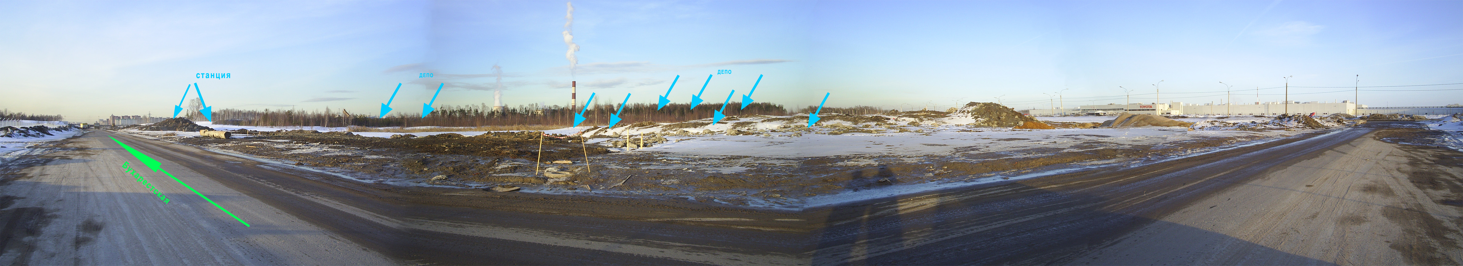 Сделал панорамку почти от угла продолжения Бухарестской ул с Автозаводской. Видно, что подготавливают квартал с предполагаемым депо - производят насыпку грунта, прокладывают инженерные сети вдоль продолжения Бухарестской. Сейчас в квартал вывозят тонны снега :) Ст. Южная будет находиться приблизительно в 300м южнее КАД и в 100-150м восточнее Бухарестской ул. и вдоль нее.