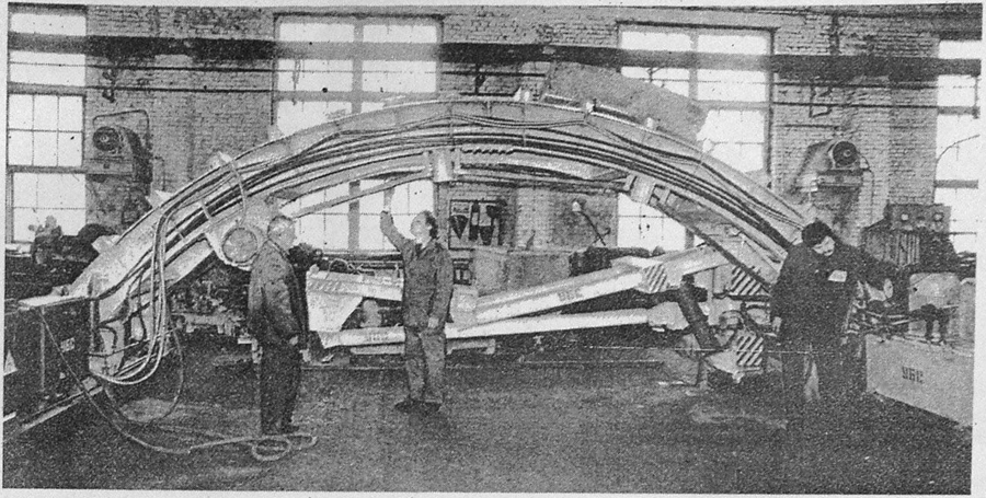 Только на последнем фото изображена арка для монтажа блоков верхнего свода колонной станции. Она имеет гораздо меньший пролёт. При помощи такой арки собирали верхние своды поперечных камер на "Площади Мира" и "Спасской" (они идентичны верхним сводам колонных станций).