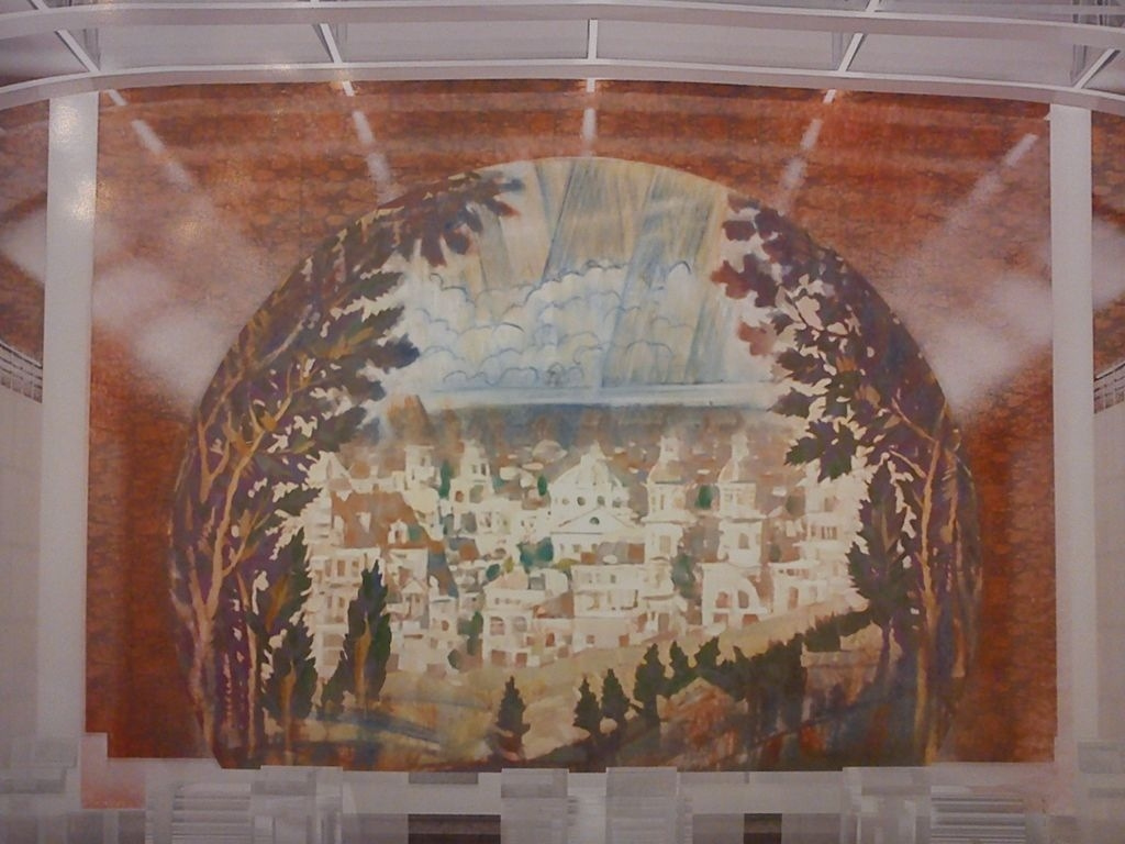 Где на панно изображён Бухарест? Можно в нём увидеть любой город, в котором полно оранжевых крыш, например.