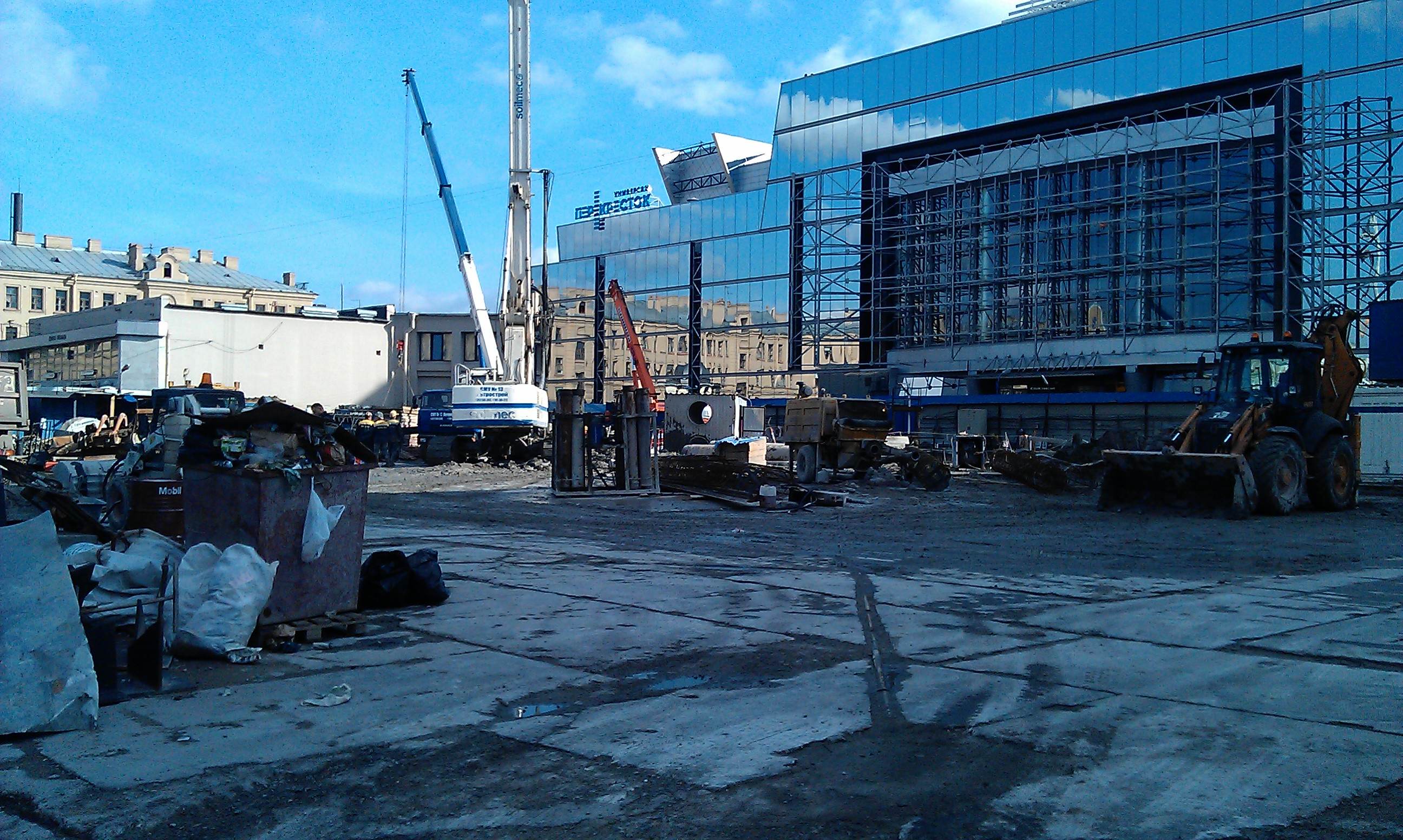 Кое-где забито шпунтовое ограждение, начата разработка котлована под здание вестибюля.