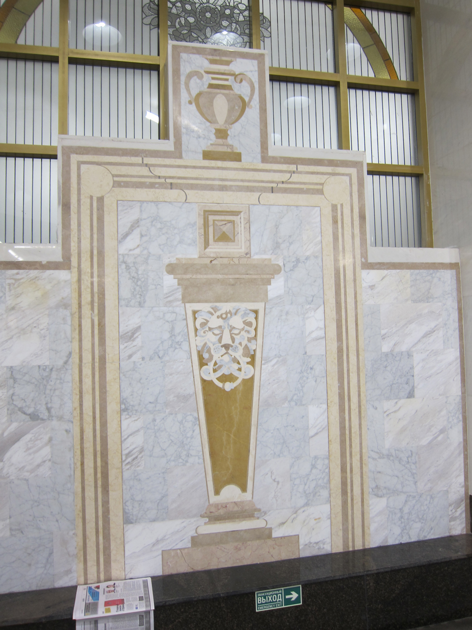 Витраж и правда освещен изнутри полностью, только нижний ряд стекол изнутри зашит какой-то обшивкой, чтобы не был виден метрошный уборочный инвентарь, который там паркуется.