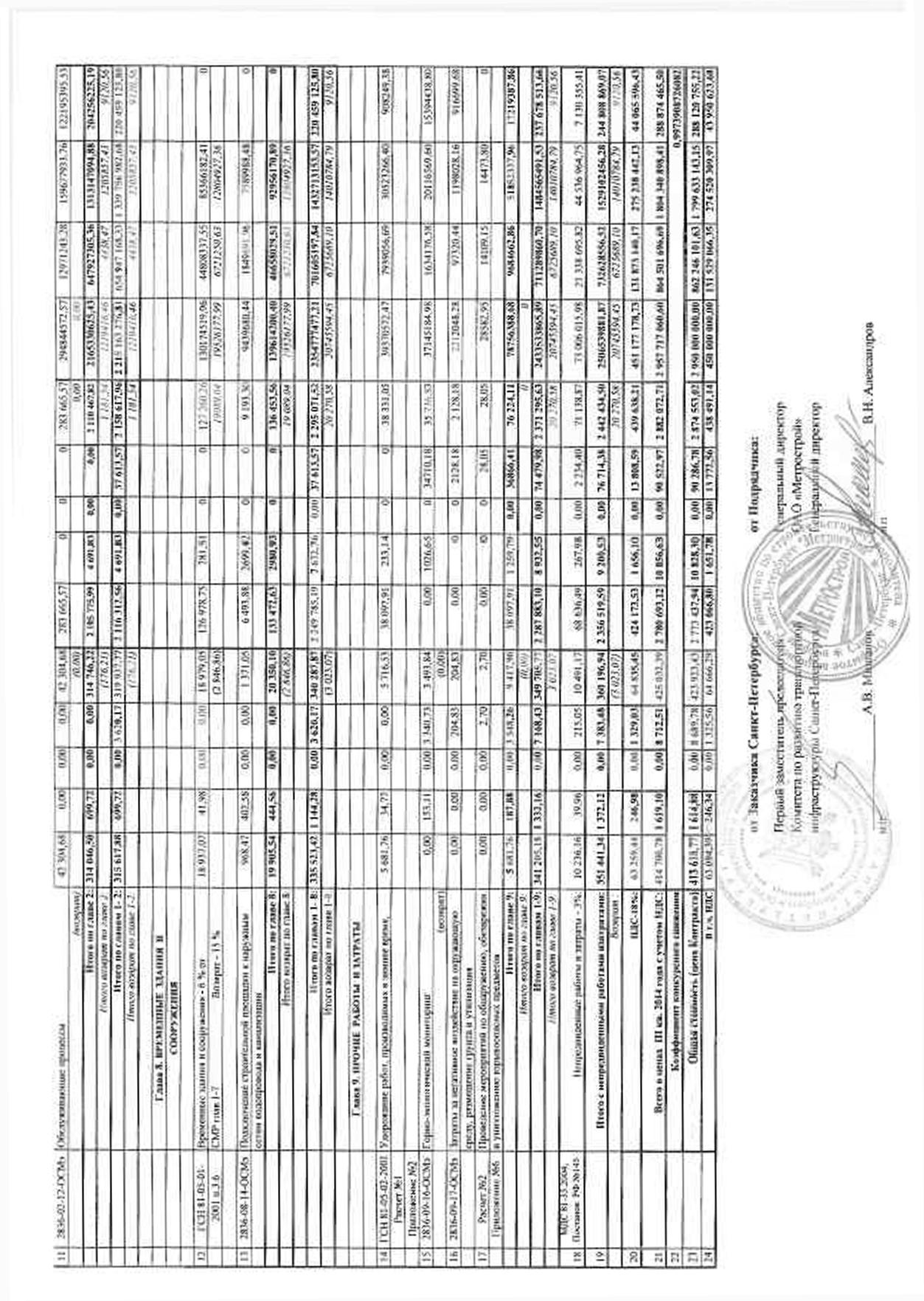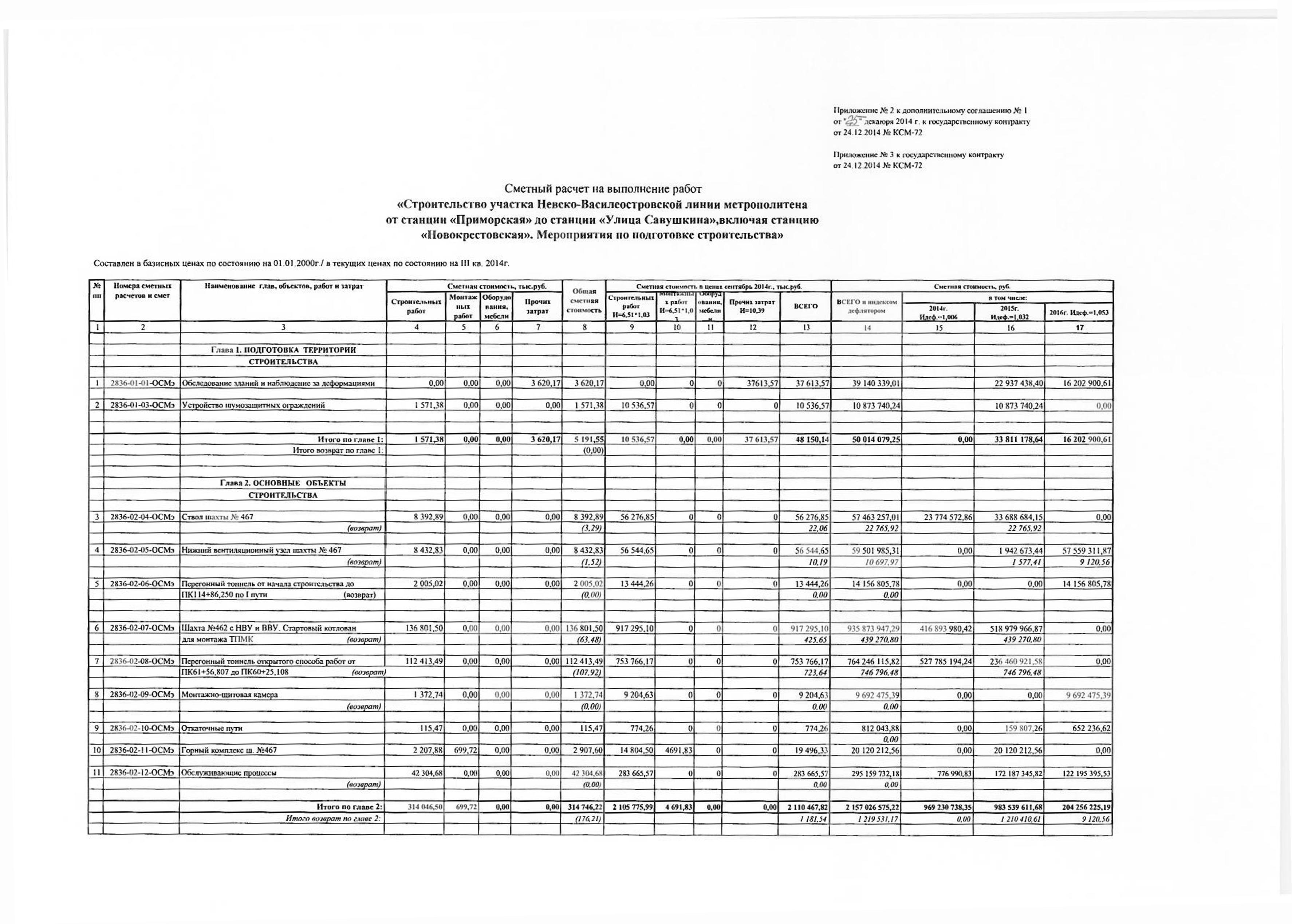 Гос. контракт и Дополнительное соглашение № 1 к ГК от 24.12.2014 № КСМ-72 на выполнение работ по объекту: «Строительство участка Невско-Василеостровской линии метрополитена от станции «Приморская» до станции «Улица Савушкина», включая станцию «Новокрестовская». Мероприятия по подготовке строительства.» (продолжение):