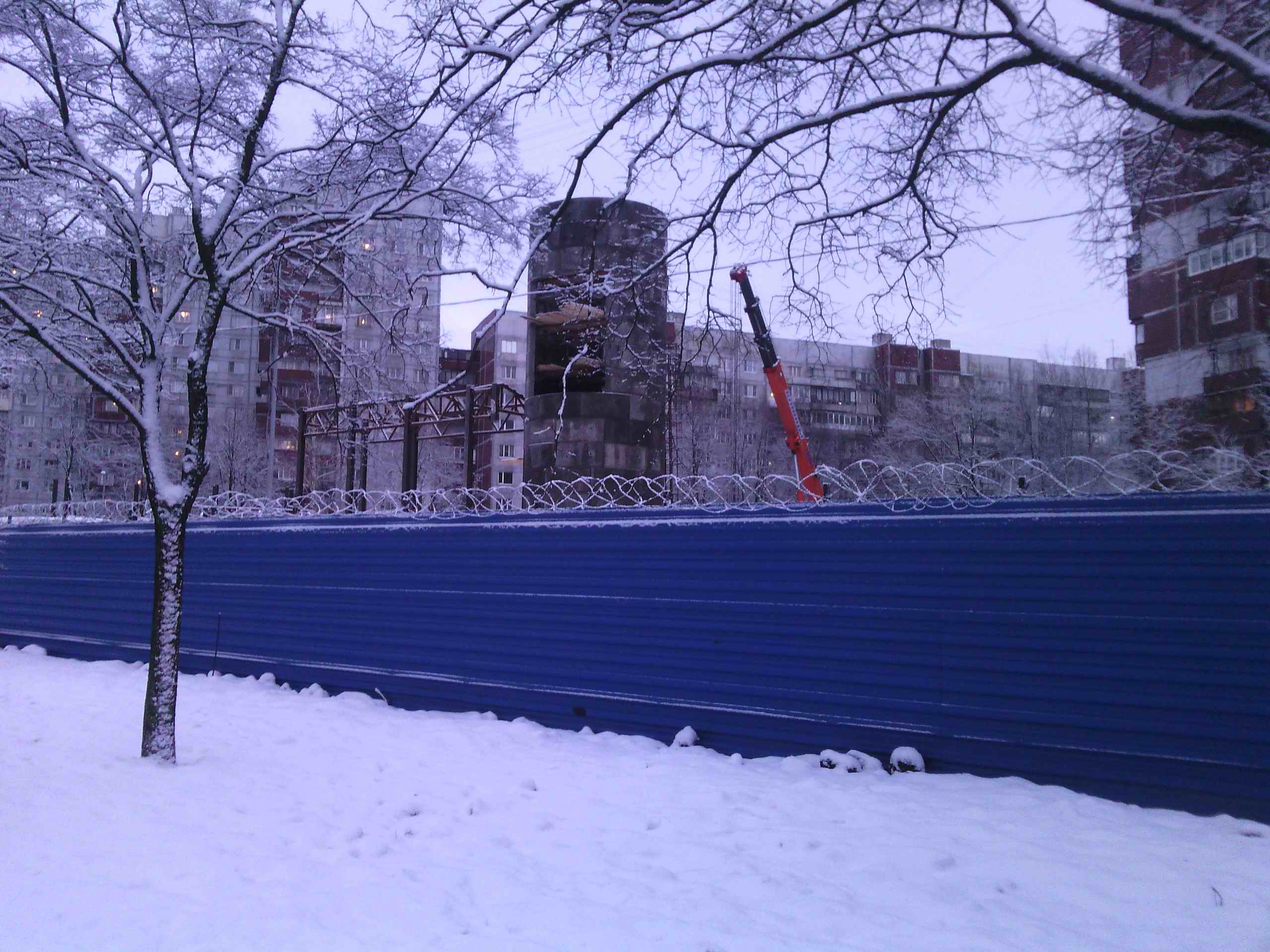 Проходил сегодня по Кораблестроителей и посмотрел как идут дела на площадке шахты №467. Дела идут :) Сегодня работают, собирают копер шахты, идут сварочные работы на металлических каркасах зданий стройплощадки. Снял на телефон.