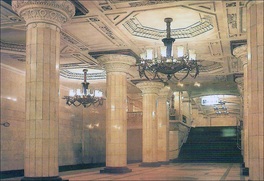 Там не только плафоны, кстати, пропали - и часть кольцевых светильников с дубовыми венками тоже отсутствуют сейчас, на фото аванзала 1957 г. видны две штуки над путями и один над лестницей, а сейчас от них осталась только лепнина на потолке, которая вместе со светильниками составляла архитектурную композицию.