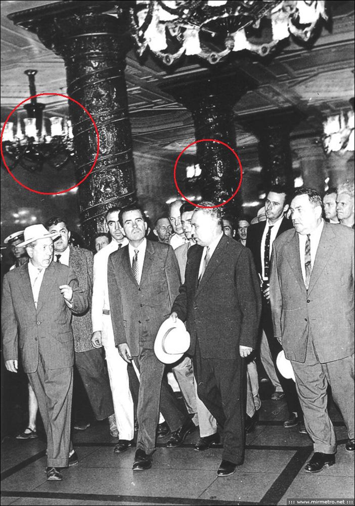 Вот на этом фото отчетливо видно, что 27 июля 1959 года во время визита в Ленинград вице-президента США Ричарда Никсона на люстрах, висящих над путями, нижний ярус светильников уже был демонтирован.