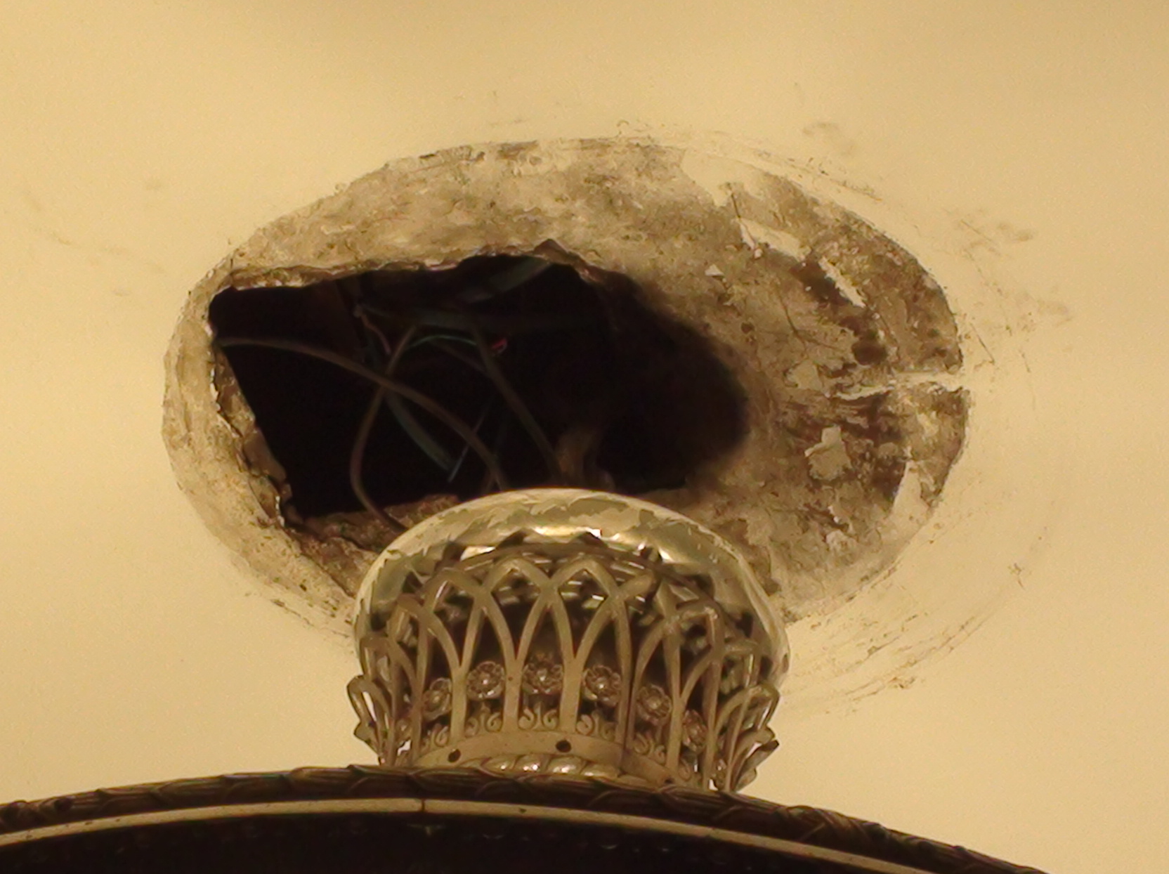 Да скорее всего ничего не случилось с самой люстрой, просто обычно на этом месте декоративный колпак. Причем все подобные колпаки висят криво и с зазорами.