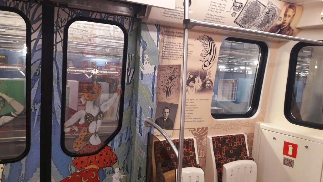 "Восьмивагонный состав модели 81-722/81-723/81-724 в красном исполнении украшен изнутри отрывками из произведений великих русских писателей и поэтов, чьи имена тесно связаны с историей Петербурга (Пушкин, Маяковский, Достоевский, Чернышевский, поэты Серебряного века)", - рассказала пресс-секретарь петербургской подземки Юлия Шавель.