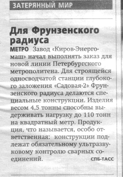 Хочется спросить: Доколе еще газетчики будут терзать своими глупыми статьями наше метро? Ладно еще название перепутано, но как, как можно назвать Спасскую односводом? Да еще и таинственные металлоконструкции для односводчатой станции. И ведь как мне известно, эта статья не единственная, что журналисты выдают подобный бред чуть ли не раз в три дня. Ясно же что никто из руководства метро или метростроя такое им сказать не мог. Или они так шпионов запутывают, чтоб никто не догадался какого же типа будет станция "Садовая2"? В общем достало меня это газетное словоблудие.Предлагаю написать письмо в редакции всех питерских газет и сообщить что станция называется Спасской и что она пилонная, и что хватит пороть чепуху.