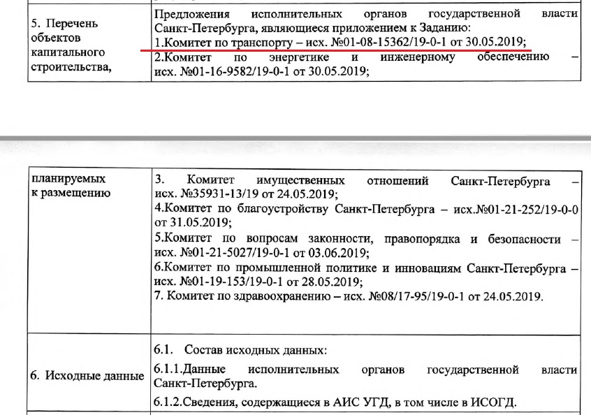Согласно указанному распоряжению исходными данными для ППТ являются предложения исполнительных органов государственной власти Санкт-Петербурга, являющиеся приложением к Заданию, в том числе от Комитета по транспорту - исх. №01-08-15362/19-0-1 от 30.05.2019 г.: