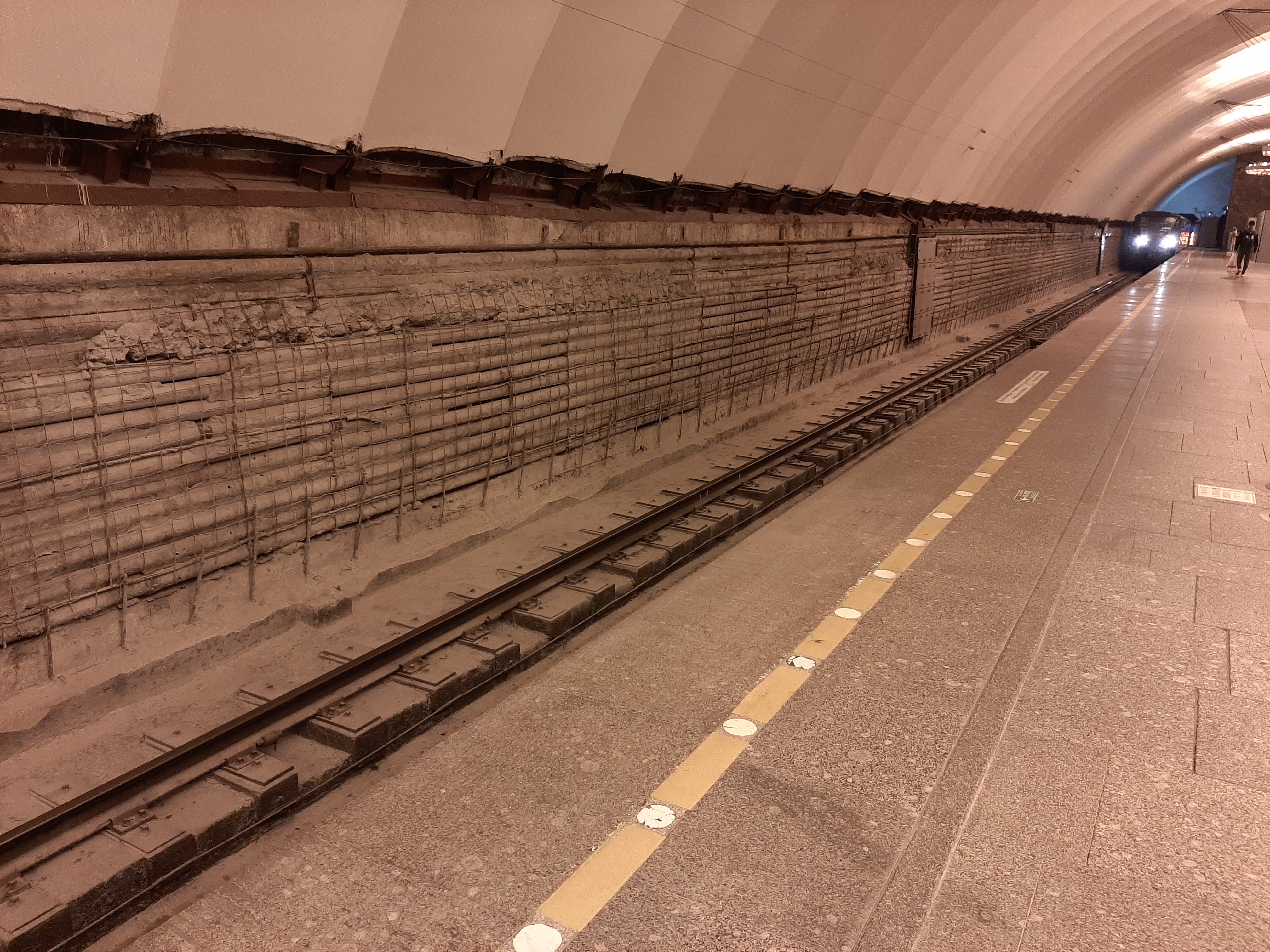 На путевой стене под сводом появились какие-то металлические подпоры, будто поддерживающие свод. Может быть к ним и будет крепиться каркас для новой облицовки...