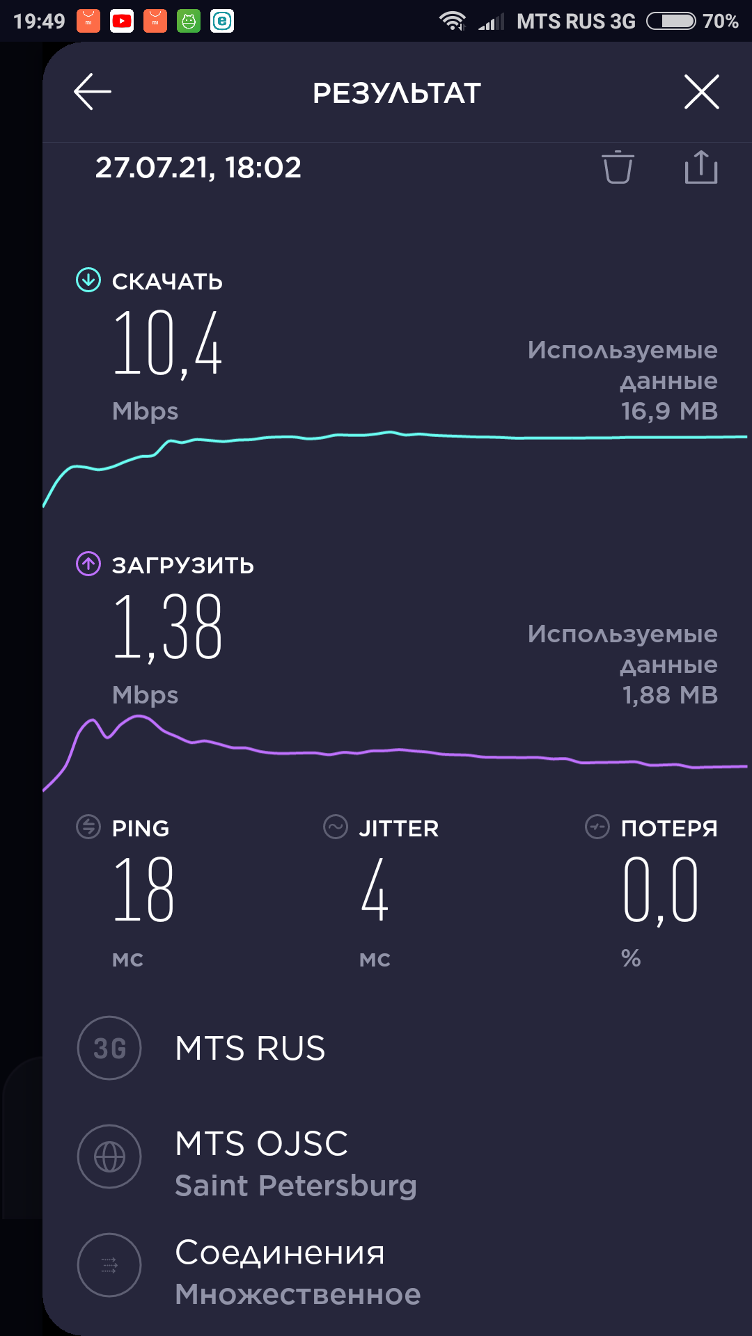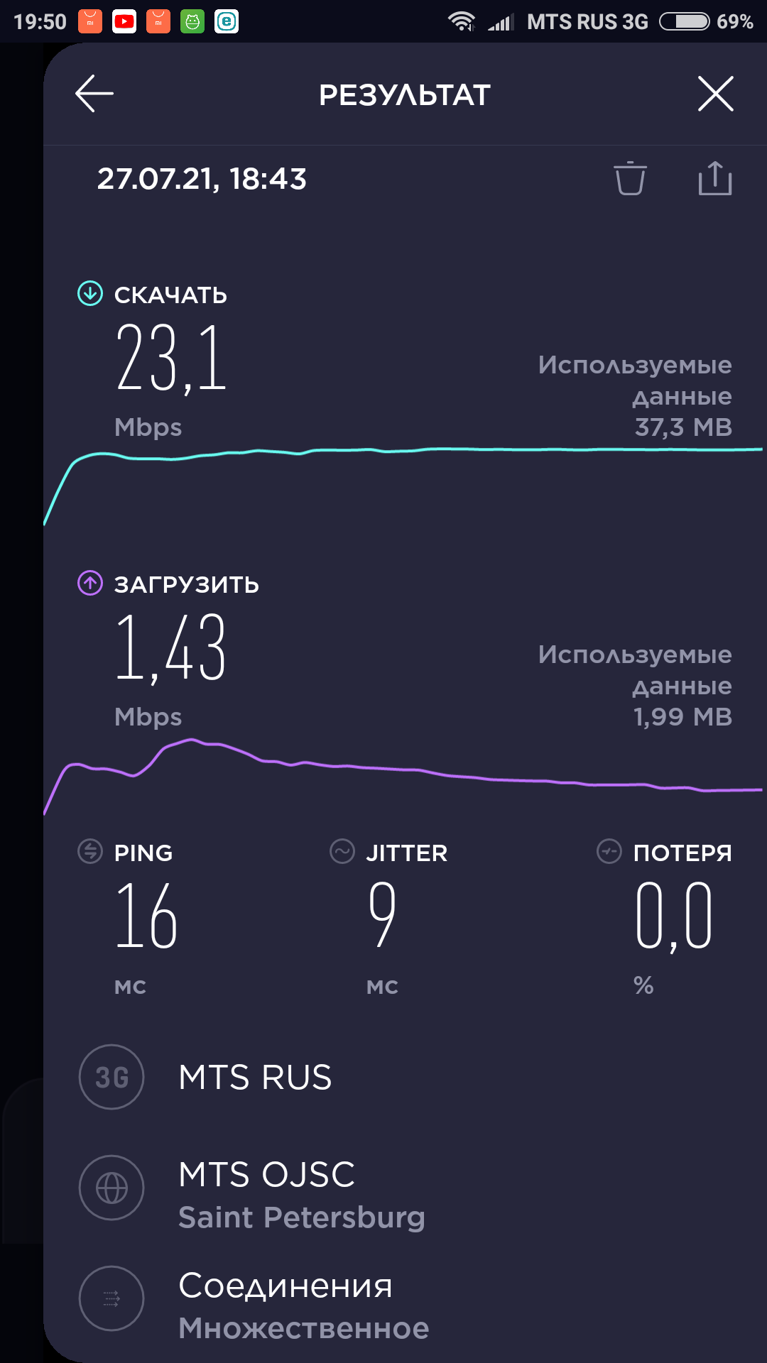 Кстати, корреляции между загруженностью поезда и качеством связи обнаружено не было. Наоборот, при забитом вагоне скорость почему-то была даже выше.