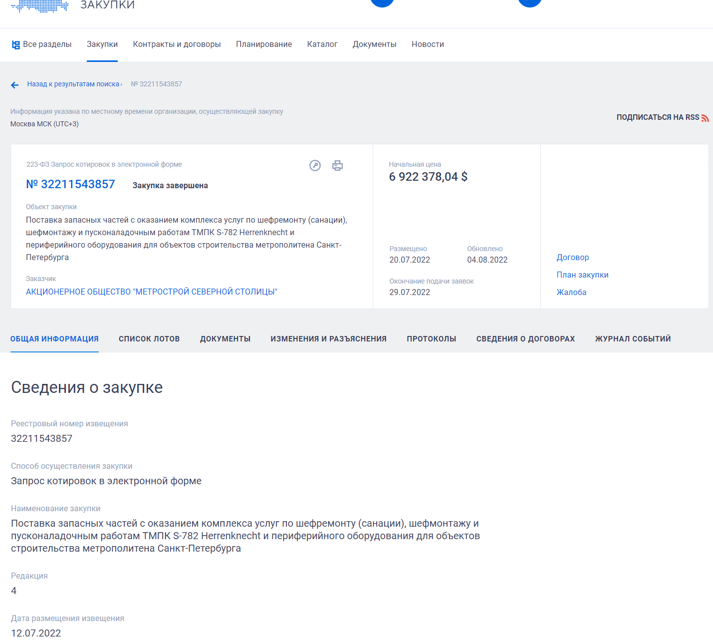 Завершена закупка на поставку запасных частей с оказанием комплекса услуг по шефремонту (санации), шефмонтажу и пусконаладочным работам ТМПК S-782 Herrenknecht