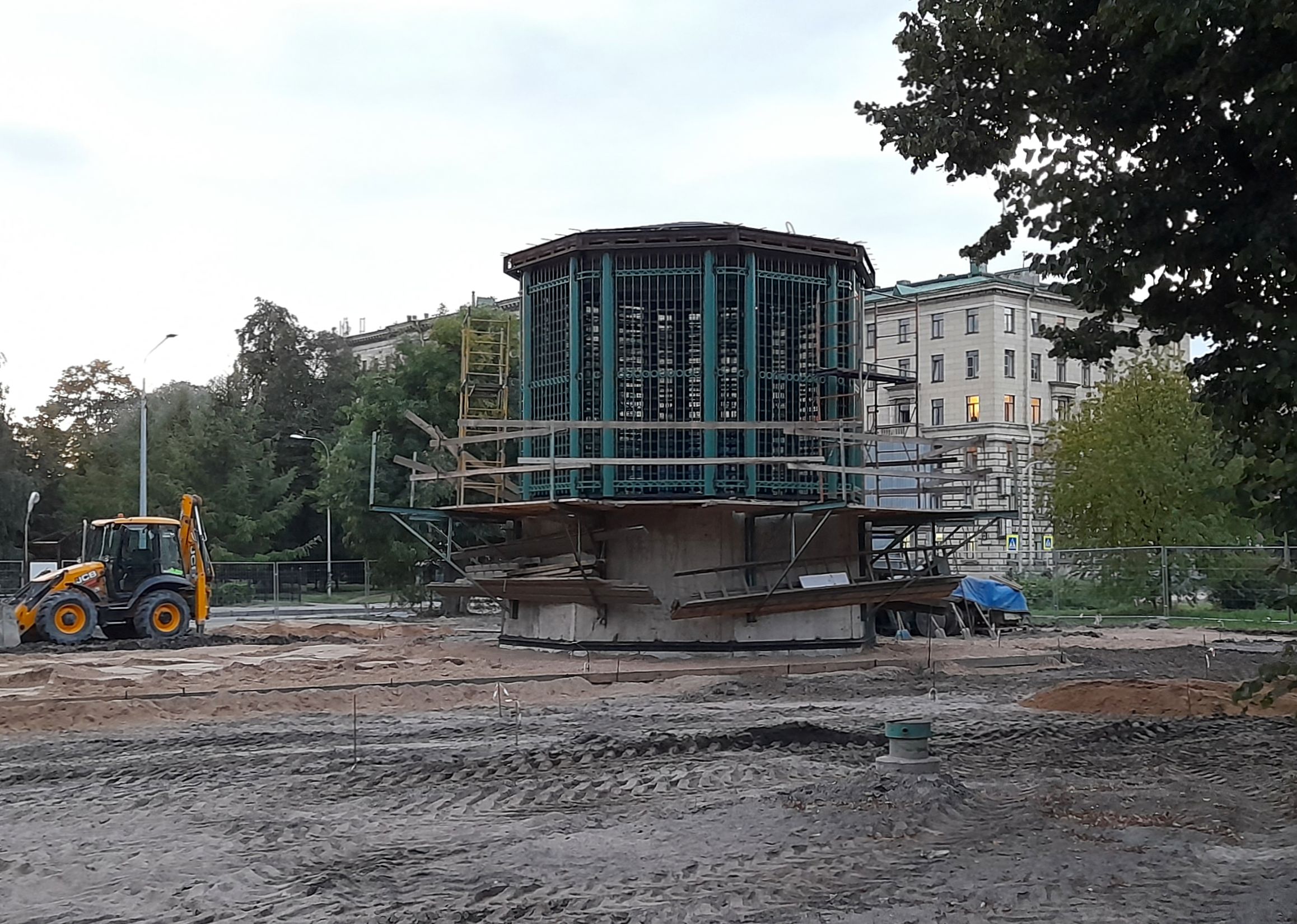 Возможно, дальнейшее благоустройство площадки требует демонтажа бытовок и подстанции, что в свою очередь, завязано на завершение работ по венткиоску, где не облицован цоколь и верх (крыша) внешне похожа (была) на решето.