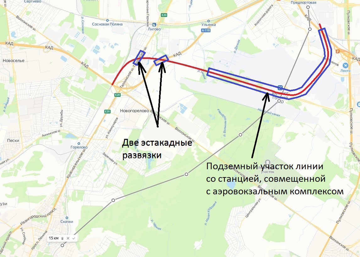 Вариант интересный. Но почему ответвление линии не от перегона "Горелово" - "Лигово"? Зачем лишние километры по полям?