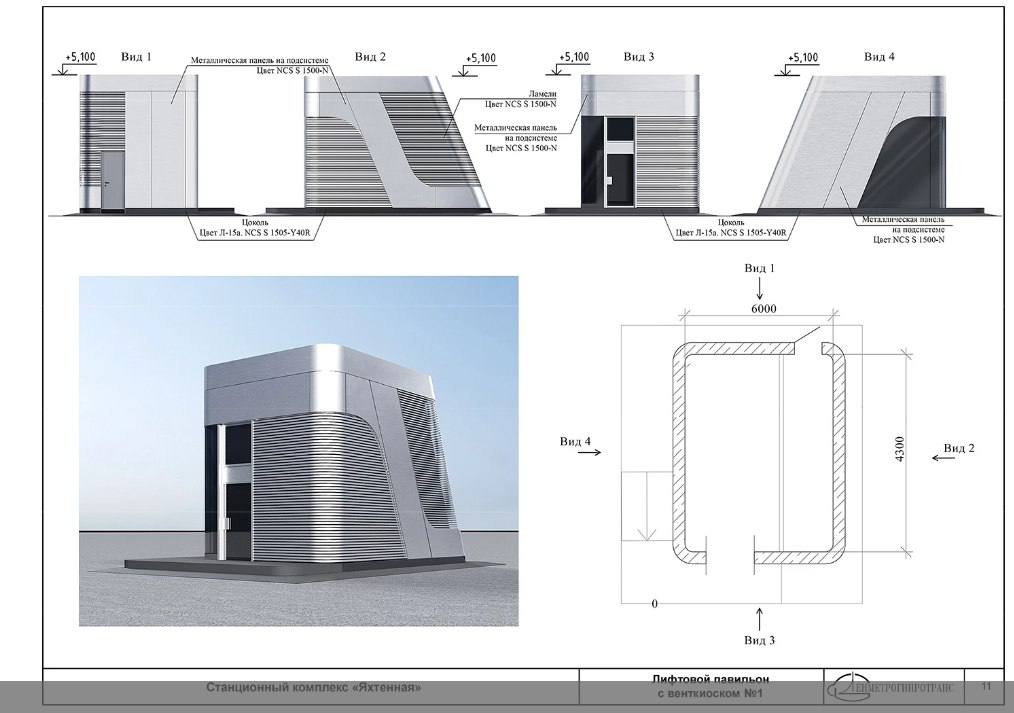 Вторая отсечка — это «Зоопарк», к которому линия завернет через Юнтолово, проскочив под ЗСД. Она, как и «Яхтенная» — мелкого заложения, на ней также четыре эскалатора. И вестибюль тоже будет находиться под землей, двери в него — через подуличный переход, который разместят под перекрестком Комендантского и Шуваловского проспектов.«Главным акцентом композиции по наземным павильонам и венткиоскам является парящий над открытым лестничным спуском навес, выполненный из металлического каркаса с отделкой из металлических монохромных панелей. Примыкающий к зоне входа венткиоск своей формой подчеркивает динамичную форму входной композиции».