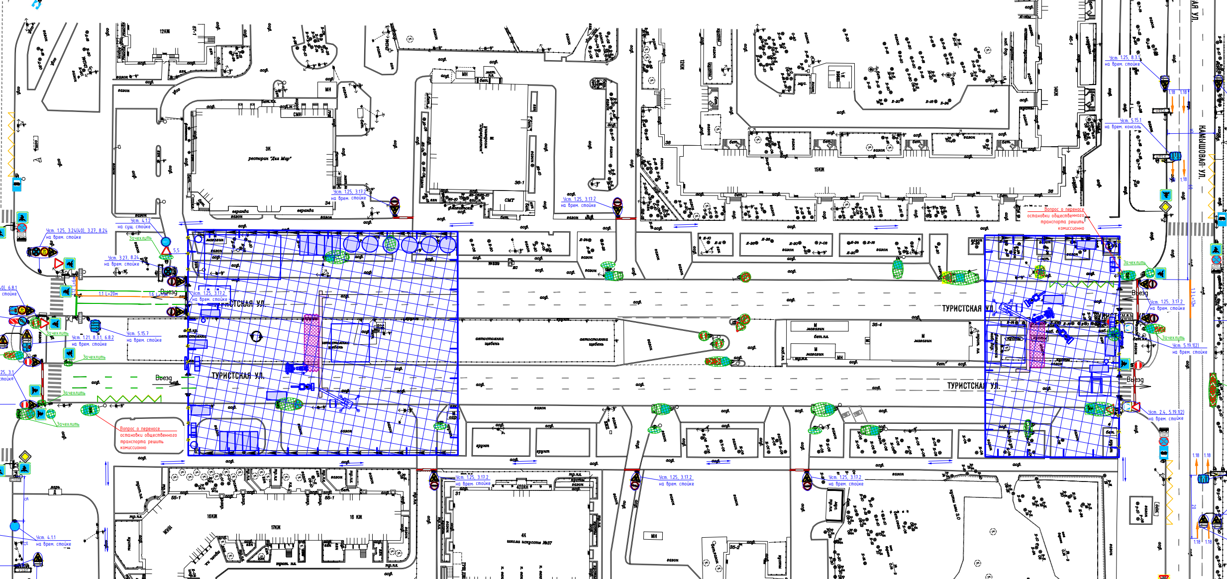 Зона производственной работы на будущей станции "Богатырский проспект" отмеченая синим - 1 этап, красным - 2 этап