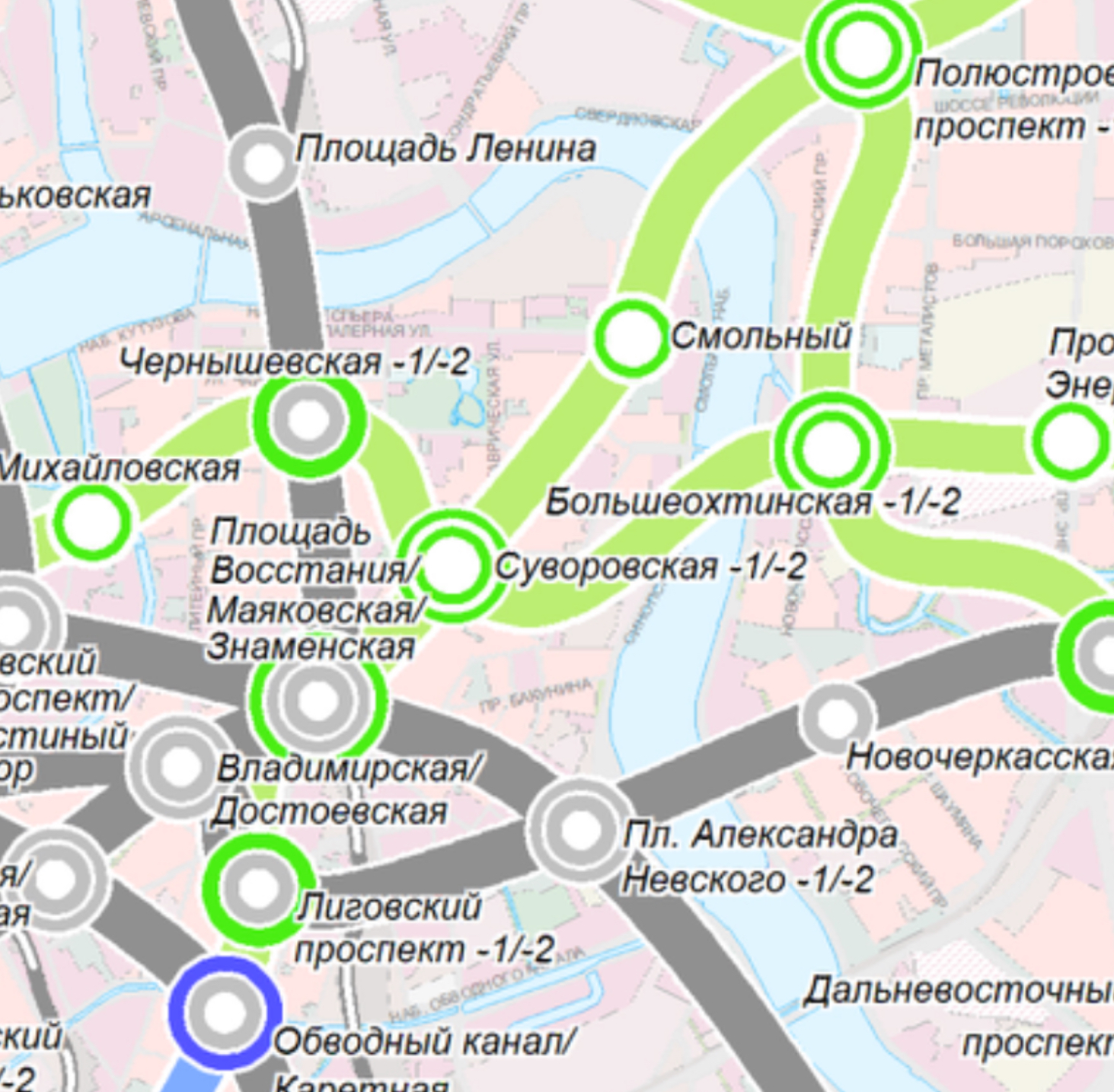З.Ы. Посмотрев на изначально предложенное местоположение Суворовской, понял, что это в метрах 100 на северо-восток от него. Зачем тогда вообще станция в районе Смольного?
