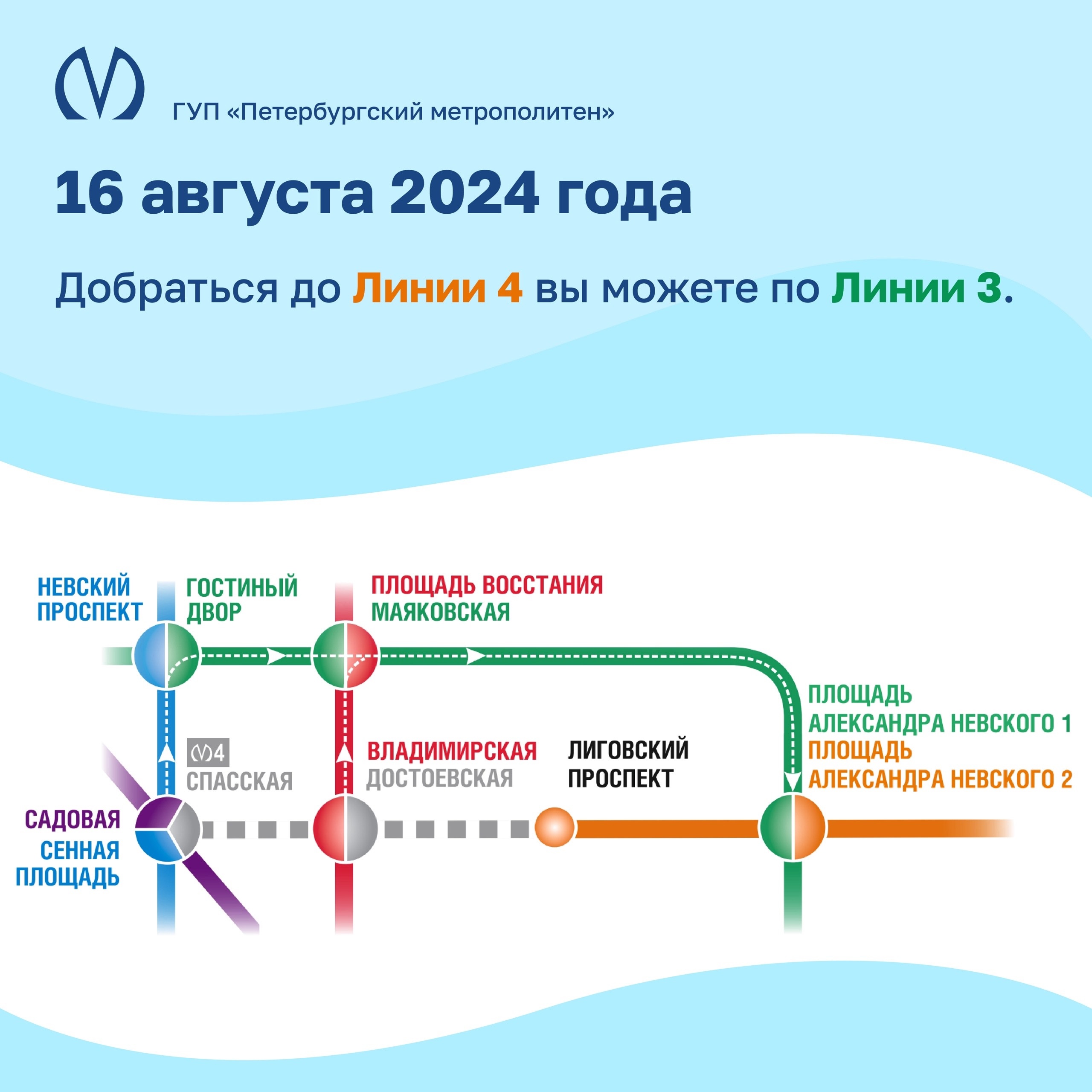 В связи с проведением строительно-монтажных работ на участке строящегося метрополитена от станции «Спасская» до станции «Горный институт» 16, 17 и 18 августа 2024 года изменяется график движения поездов на Линии 4 и режим работы станций.