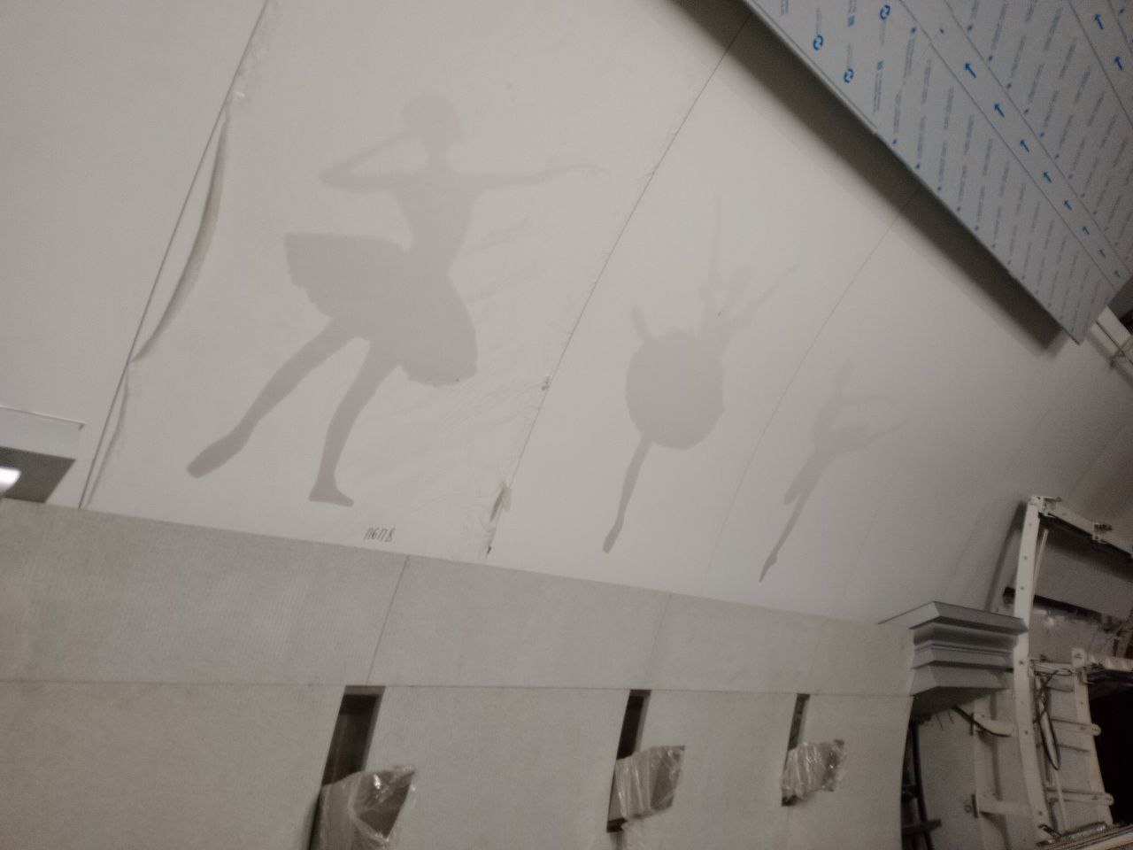 оранжнвую ленту нужно приклеить по краю платформы и ниже рекламу в зеркальном отображении, чтобы зеркала не поганить. Из поезда на себя будут смотреть сквозь рекламу на окнах и знать, что это театральная.