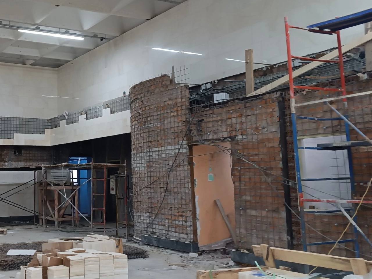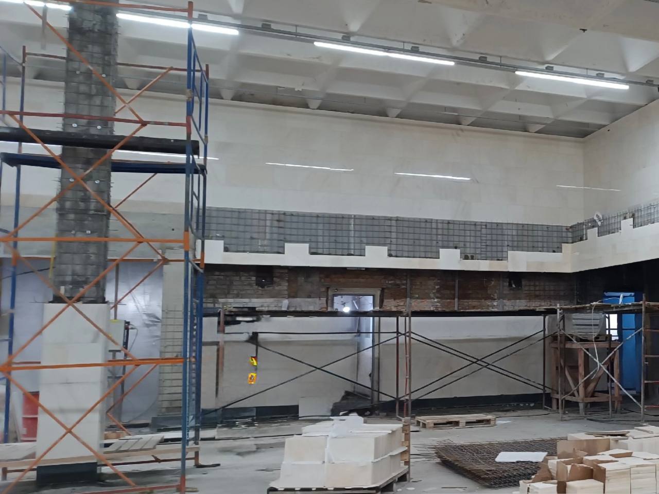Облицовку торцевой стены начали активно восстанавливать.