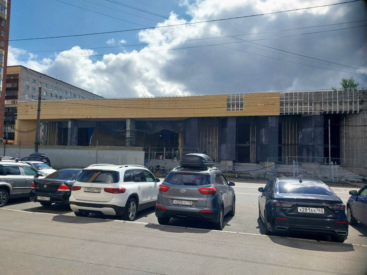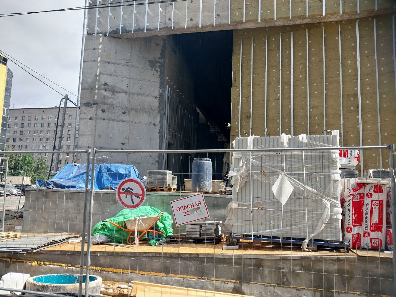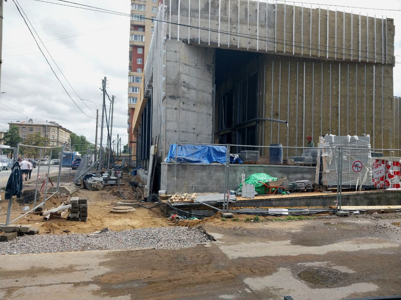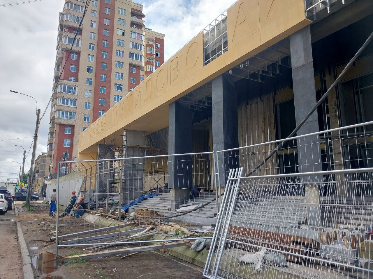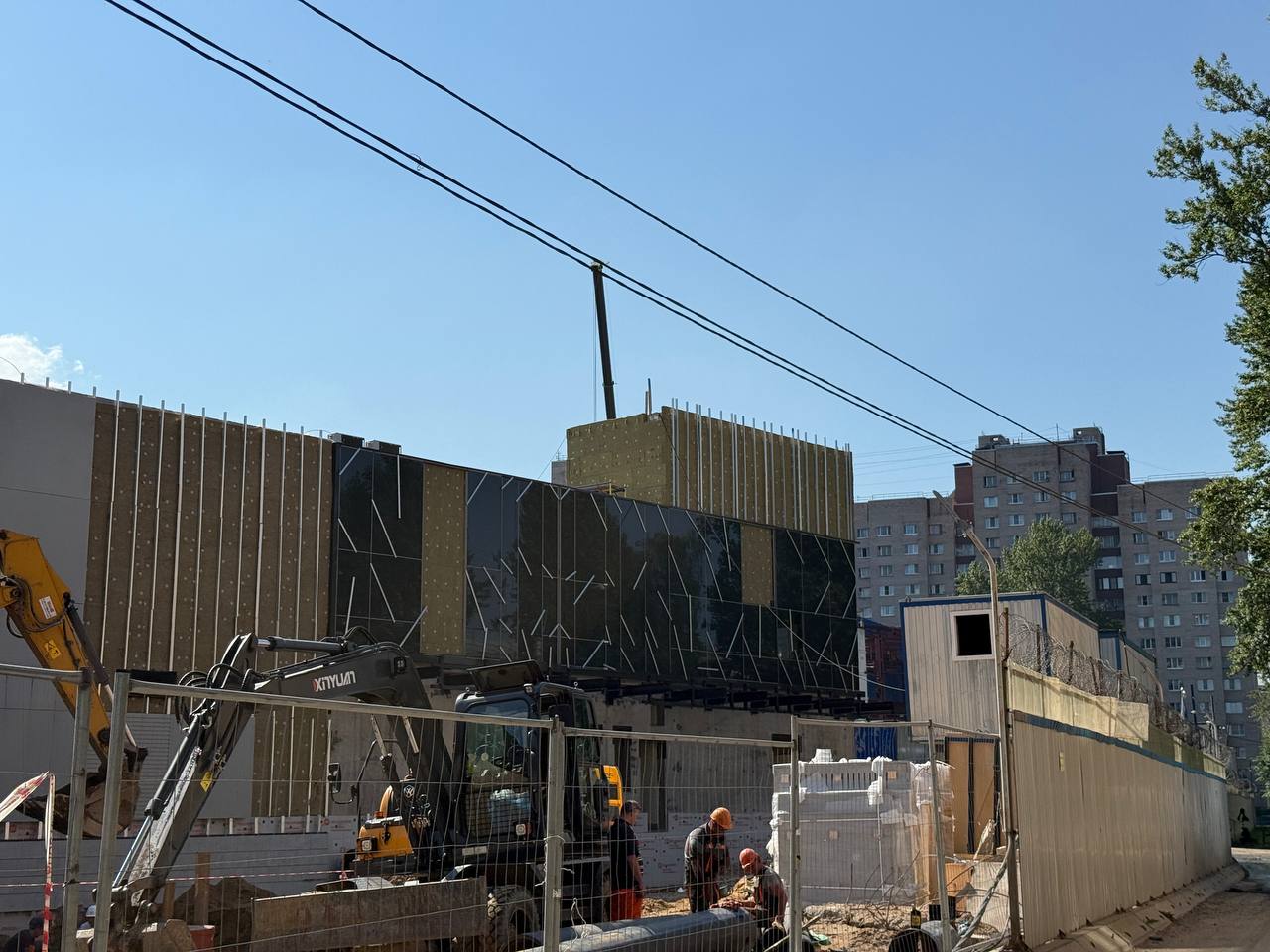 Со стороны проезда между вестибюлем и ДК имени И.И. Газа идёт установка стеклянных фасадных панелей тёмно-серого цвета, а также прозрачных панелей в оконные проёмы.
