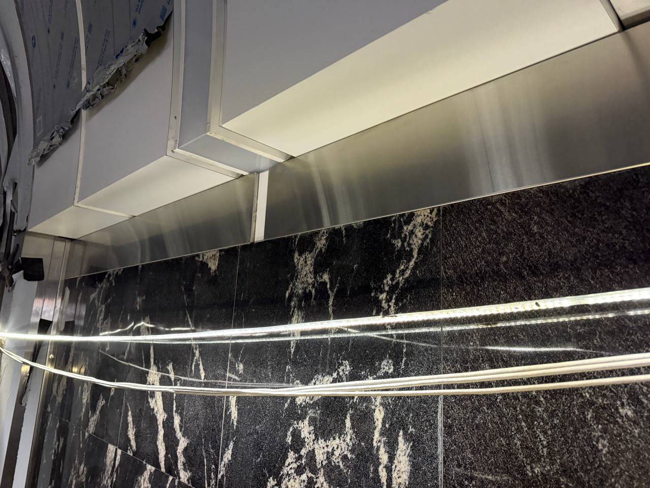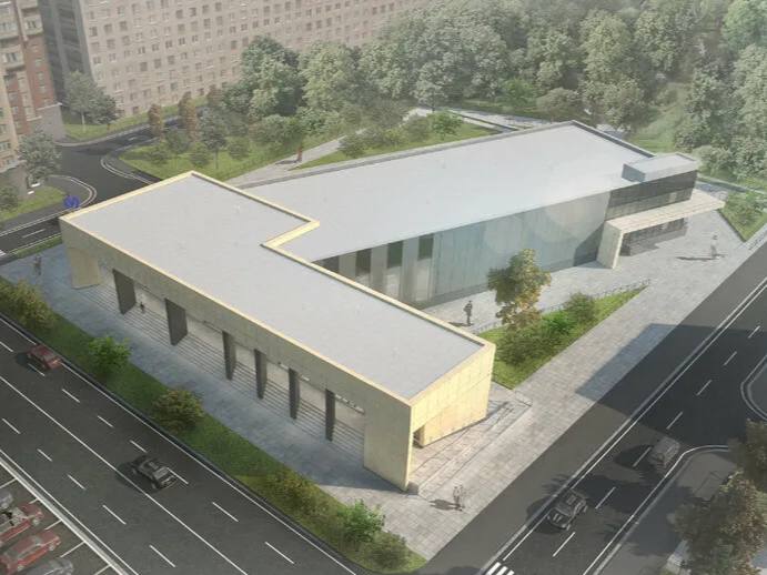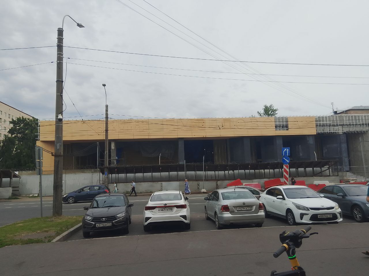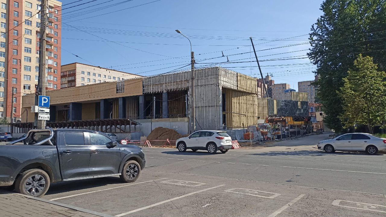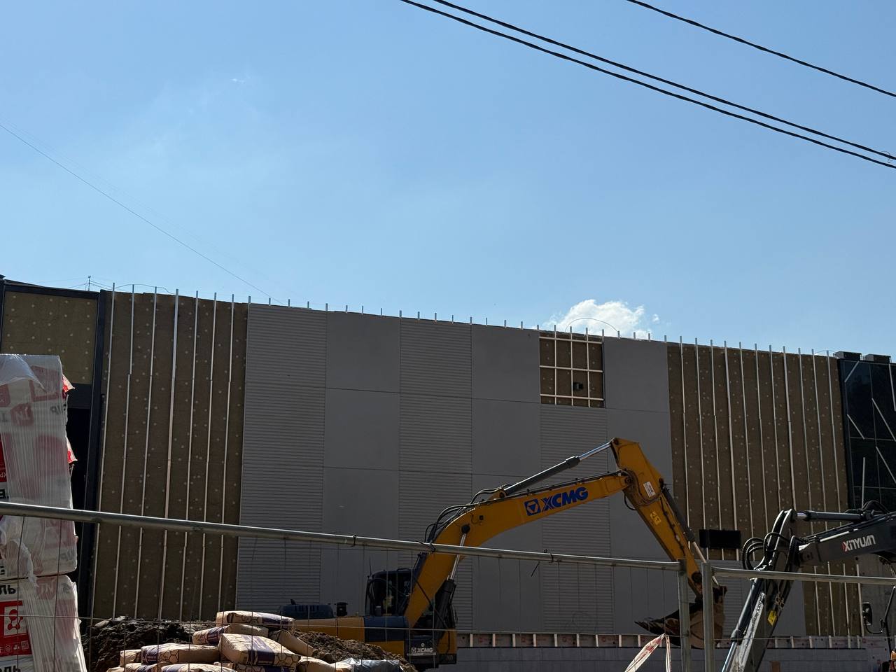 Со стороны проезда между вестибюлем и ДК имени И.И. Газа идёт установка стеклянных фасадных панелей тёмно-серого цвета, а также прозрачных панелей в оконные проёмы.