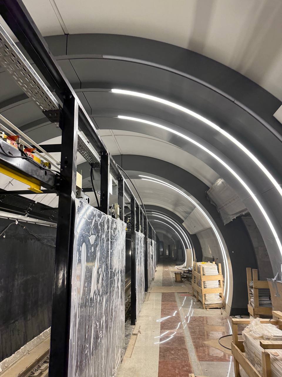 В тамбурах у входа и выхода вестибюля станции в Красносельском районе идут работы по монтажу теплового оборудования, а также монтажу потолочных элементов - кубботы и светильников.