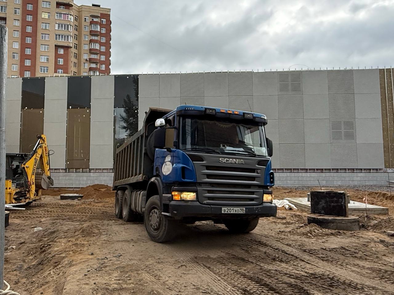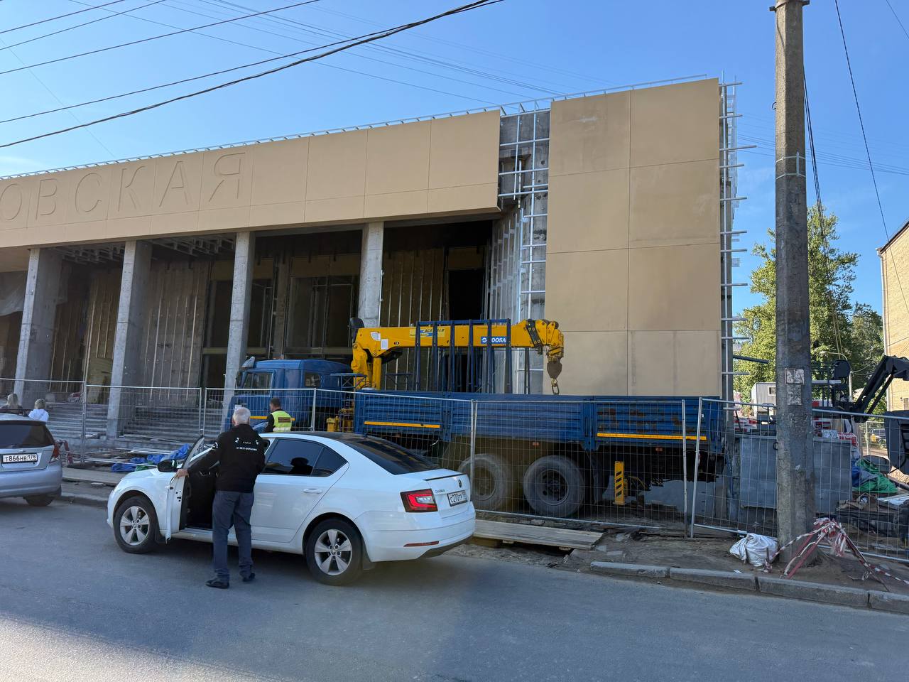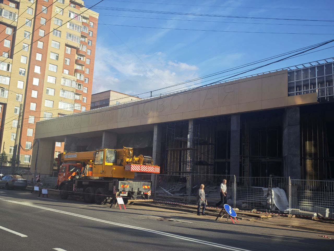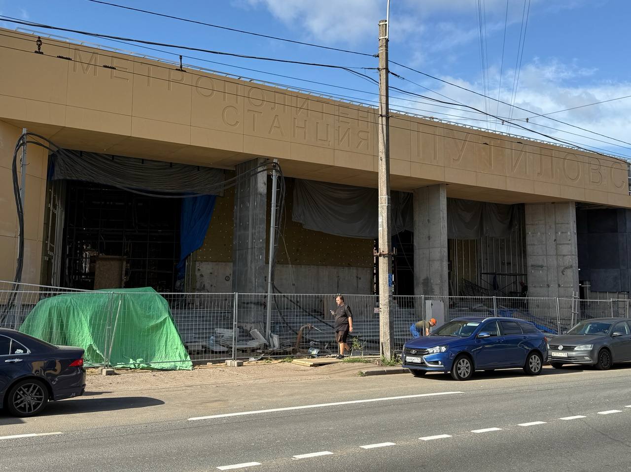 Так сегодня выглядел фасад вестибюля станции «Путиловская» со стороны улицы Васи Алексеева, на который продолжают устанавливать плиты из фибробетона цвета «охра».