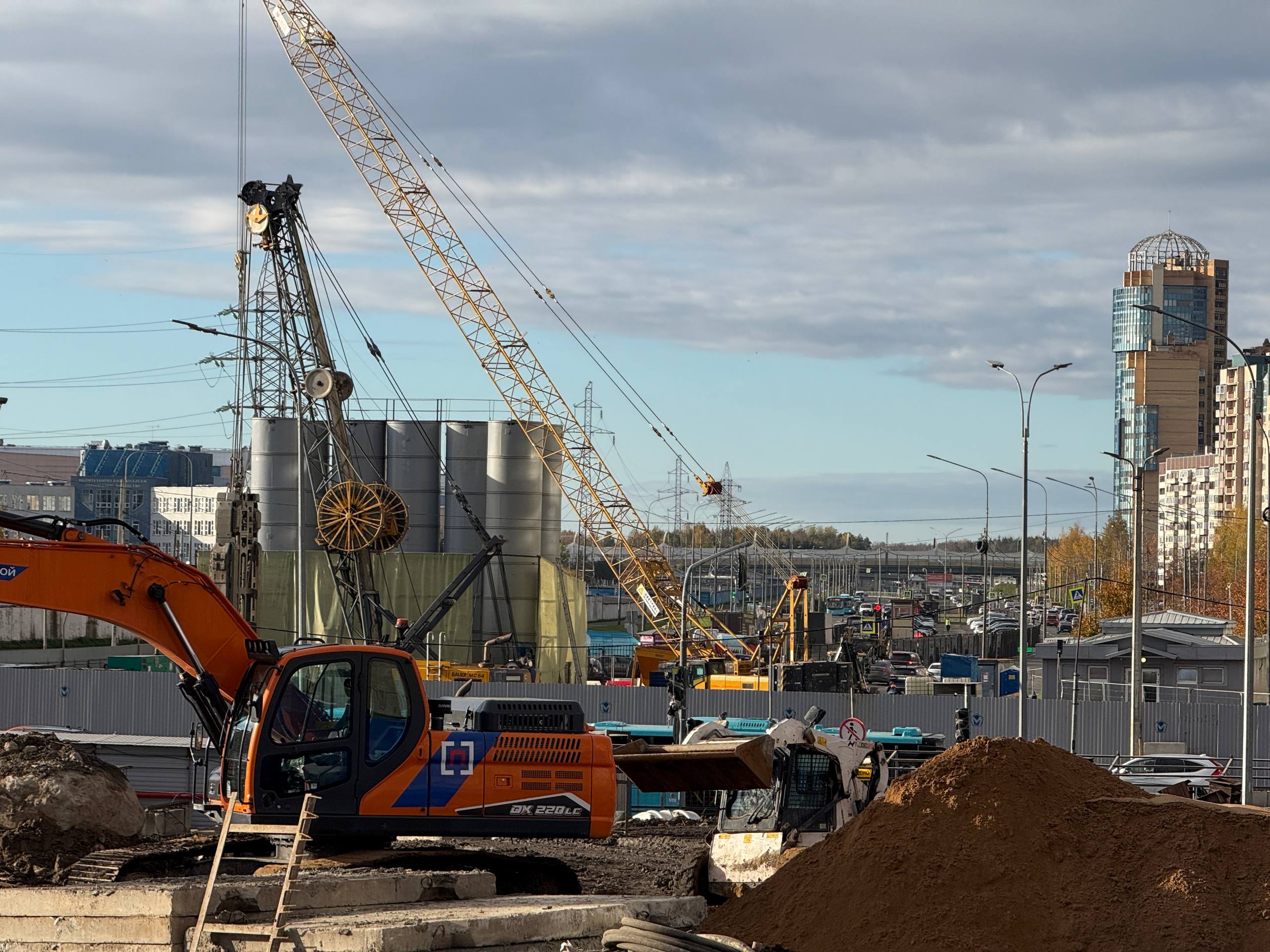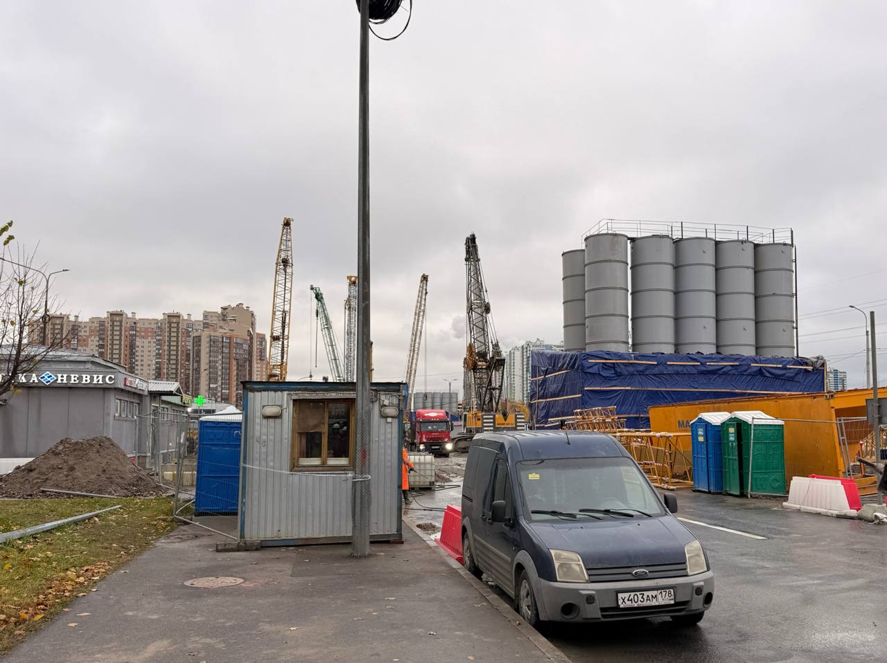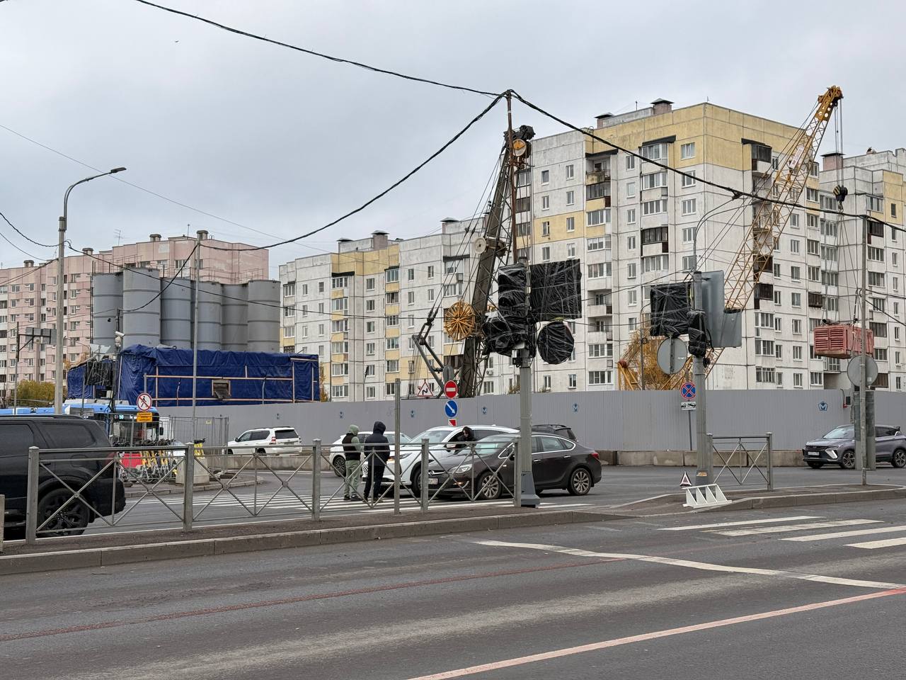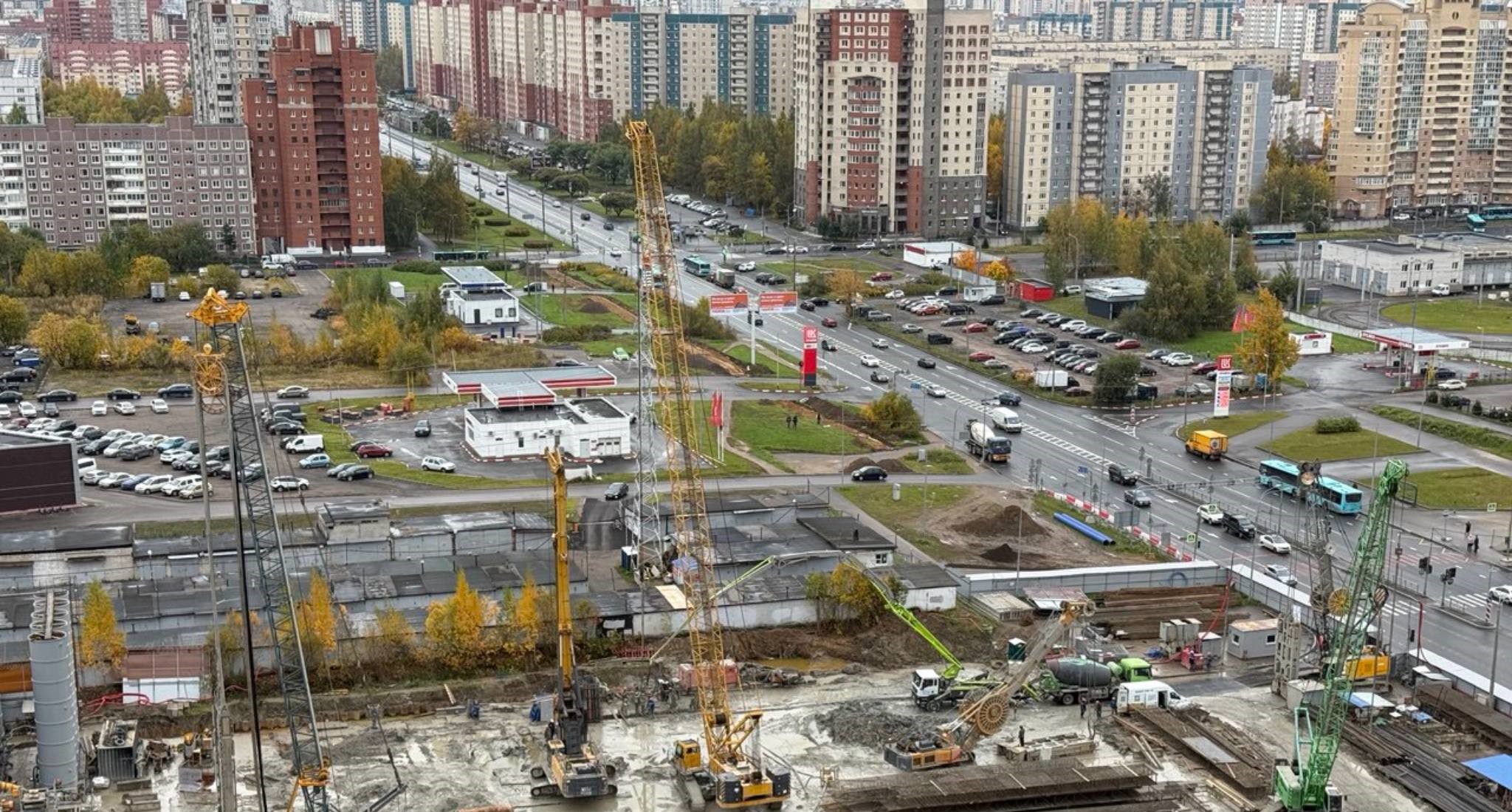 Вдоль Комендантского проспекта установлено временное ограждение из профлиста, а также оборудована крытая пешеходная галерея. Продолжаются работы по понижению уровня строительной площадки на участке от перекрёстка до подъездной дороги к гипермаркету «Лента».
