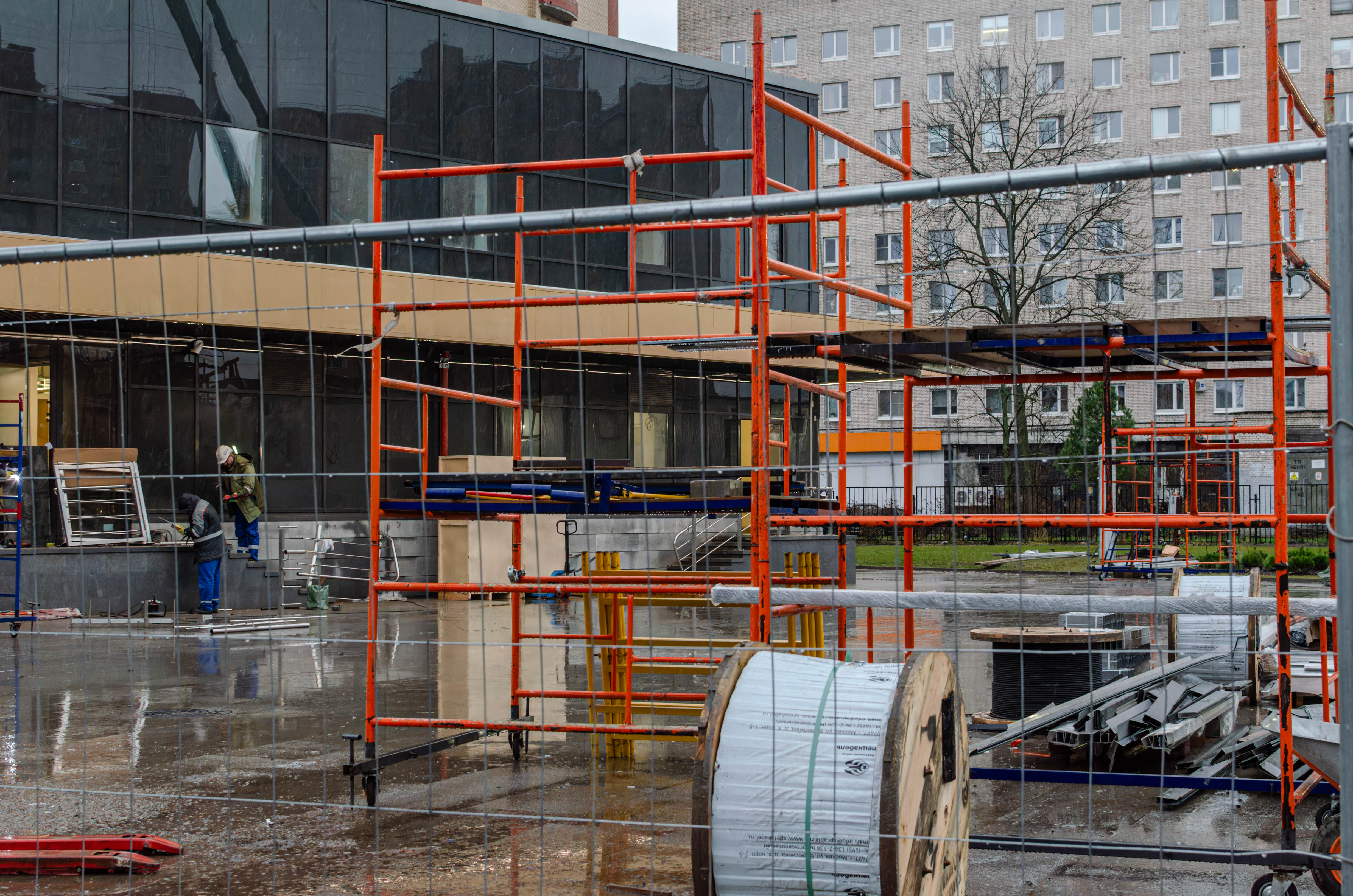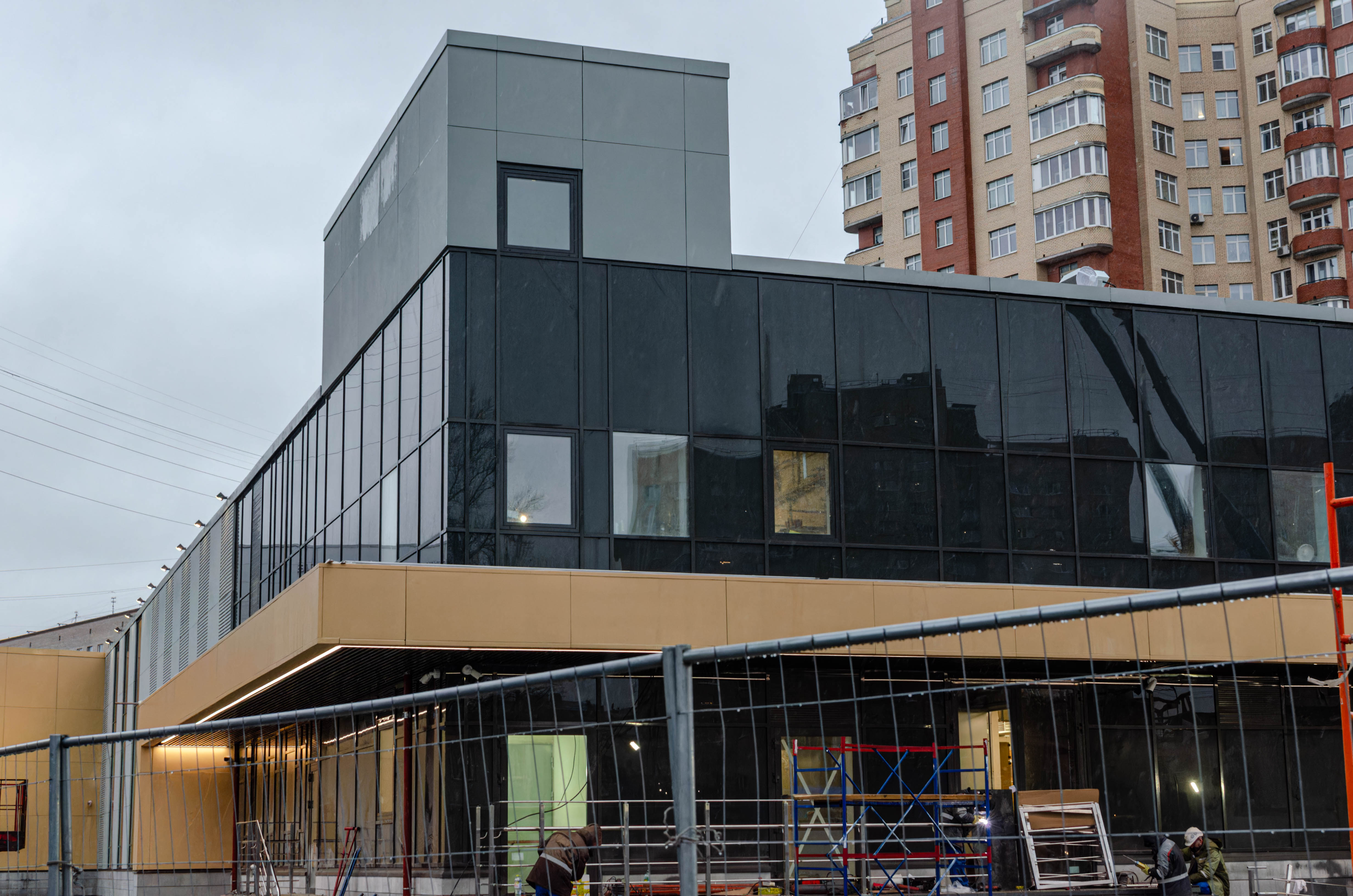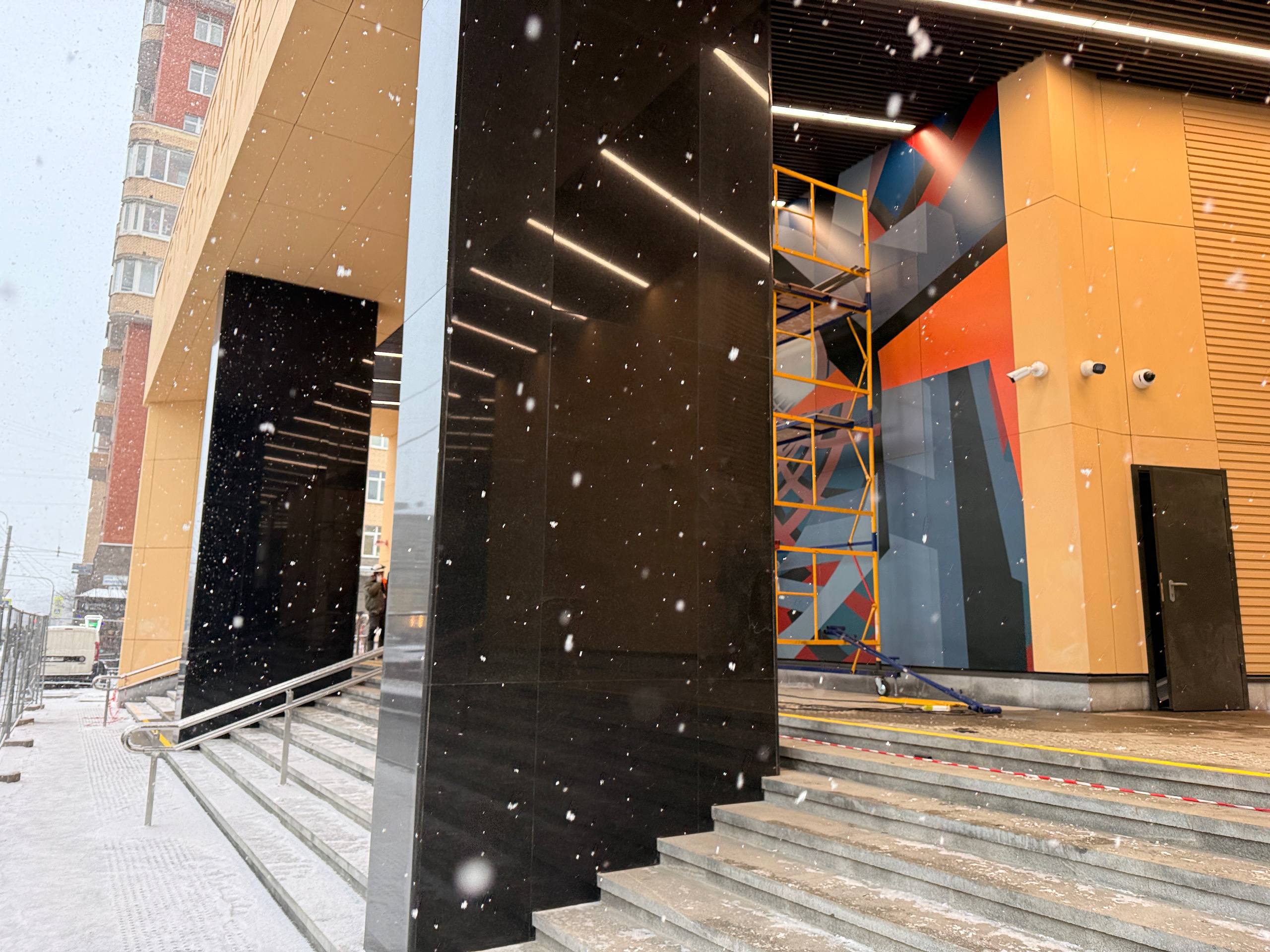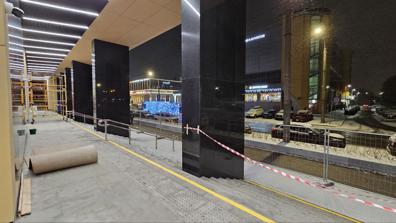 Со стороны входной группы, выходящей на улицу Васи Алексеева, завершена установка всех дверей входа и выхода из вестибюля, а также дверей коммерческих помещений.