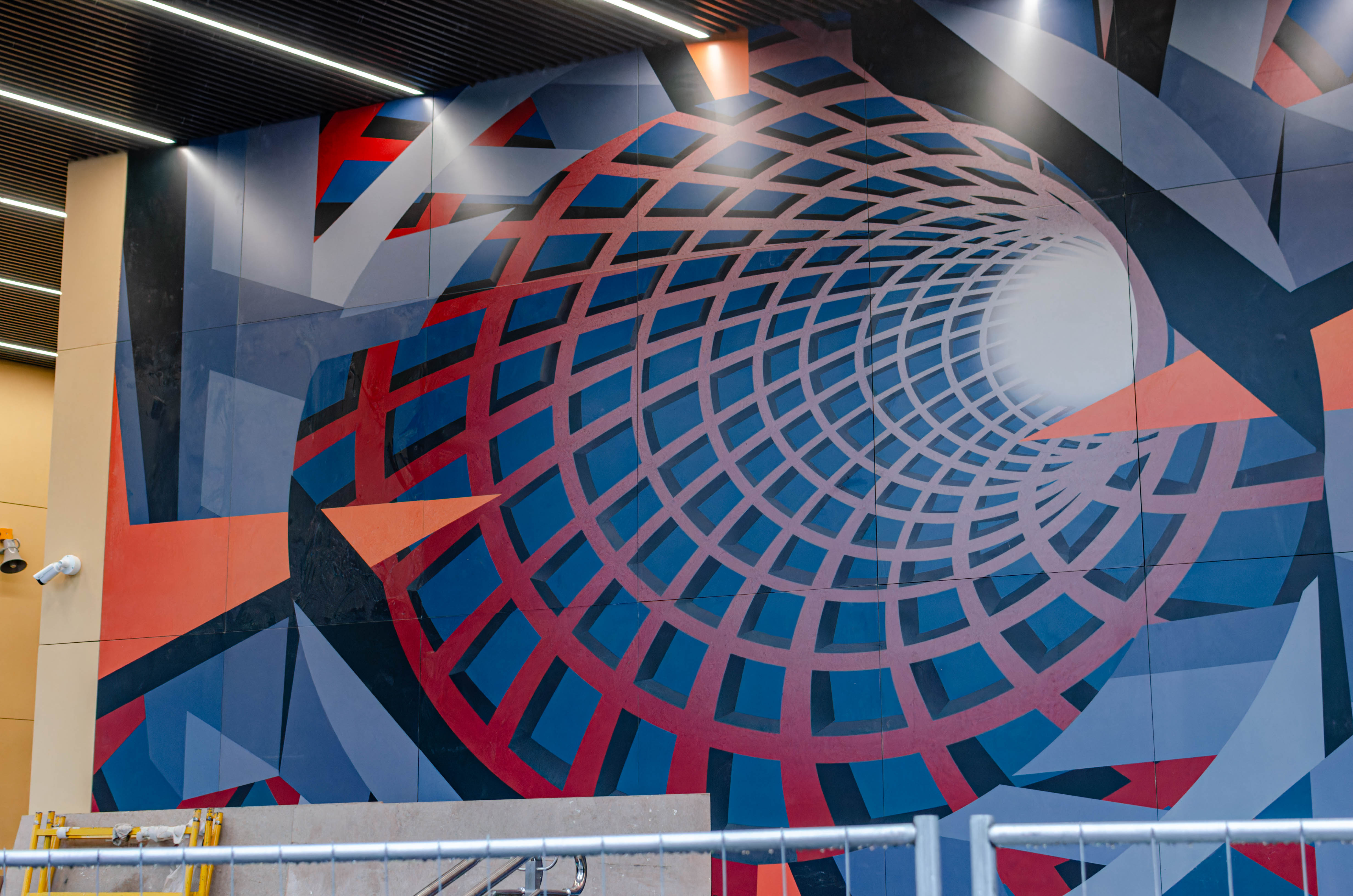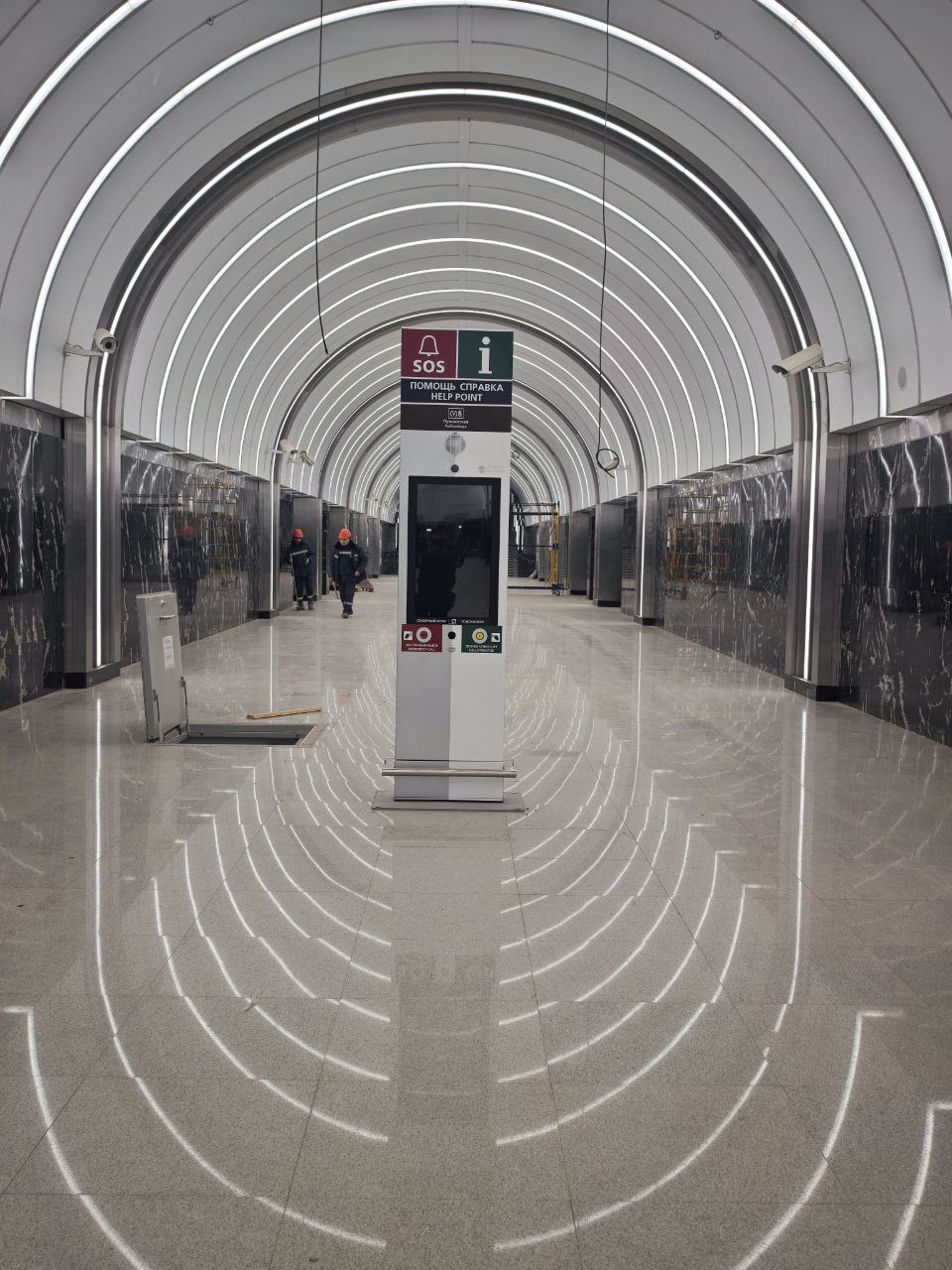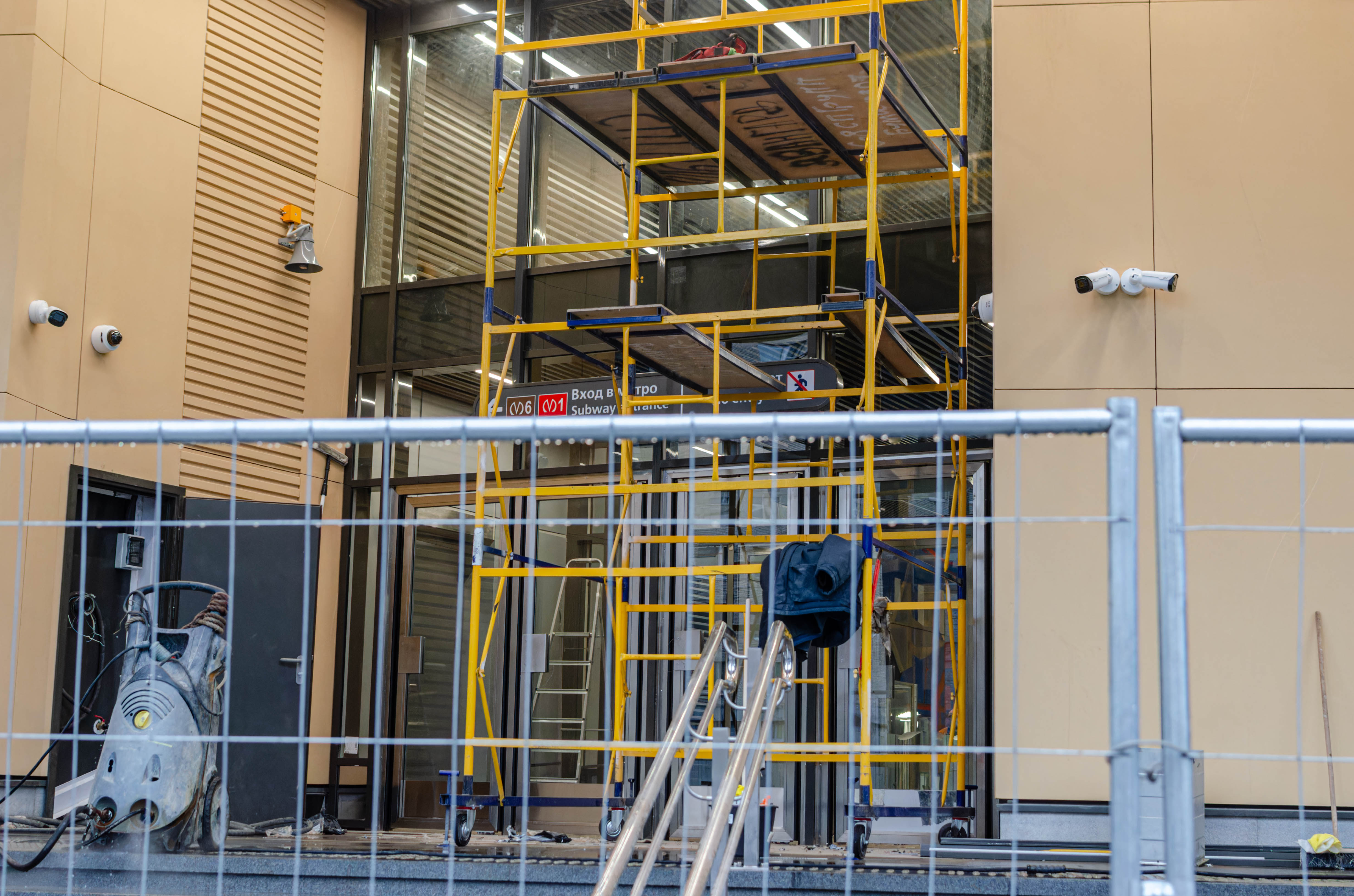 Завершена облицовка вестибюля панелями из фибробетона и смонтировано декоративное панно. Завершена облицовка ступеней, пола и пандуса для маломобильных пассажиров гранитными плитами. Установлены поручни на лестнице перед входом и выходом, а также перила ограждения пандуса.