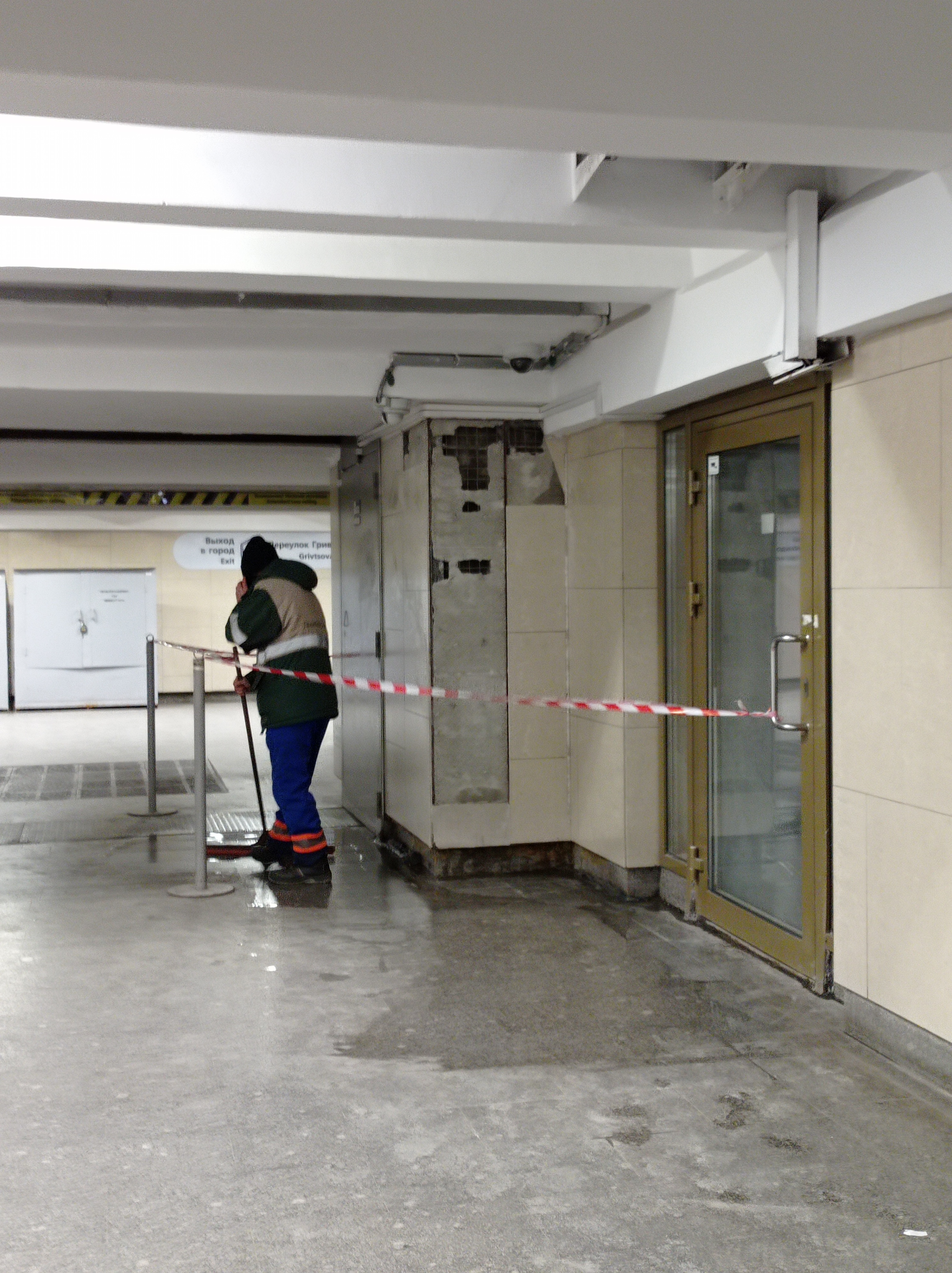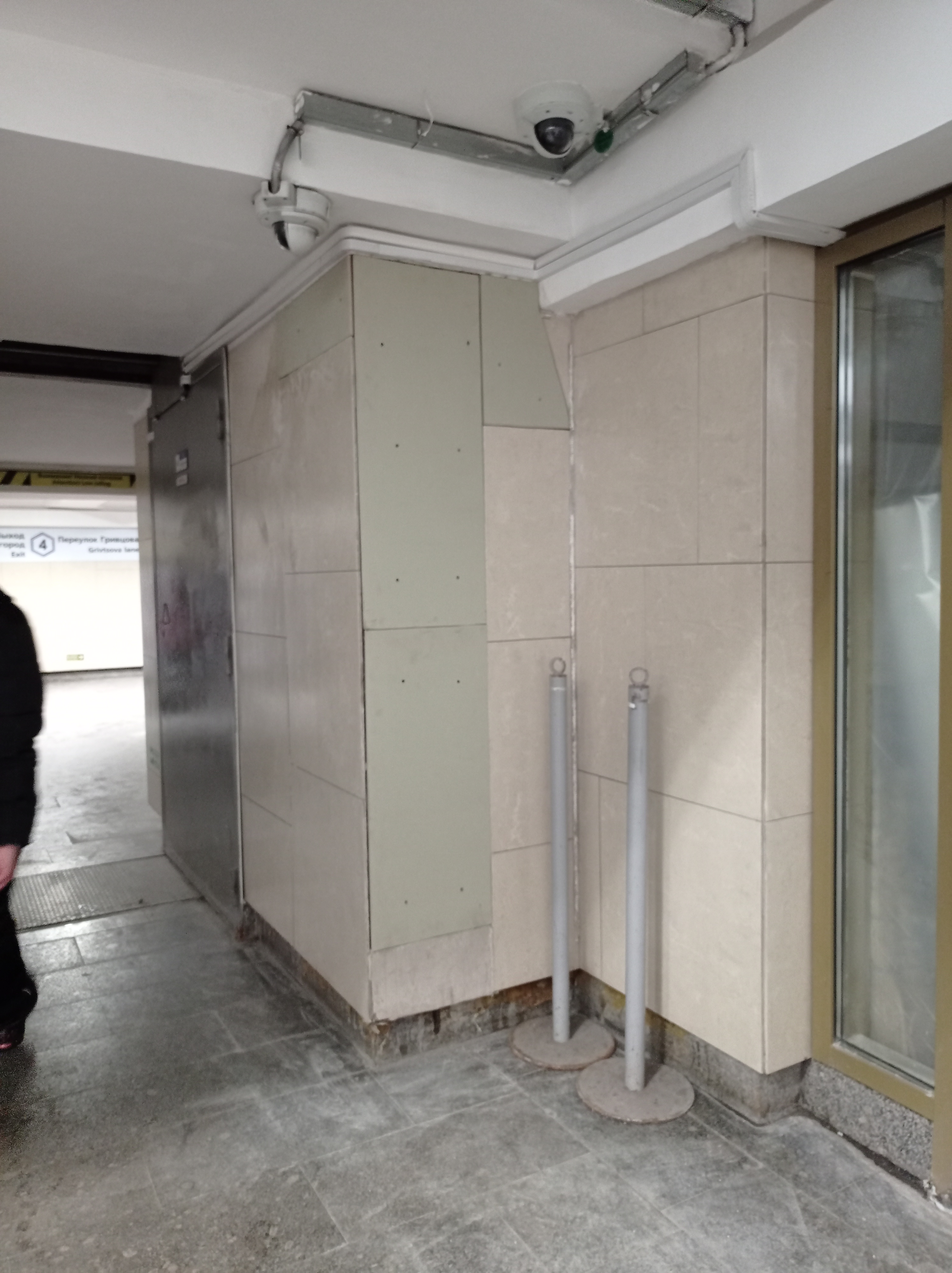 У входа в вестибюль проблемный участок стены залотали металлическими пластинами, у двух северных выходов, а именно в соединяющего коридора, огородили участок, с которого видны водопроявления.