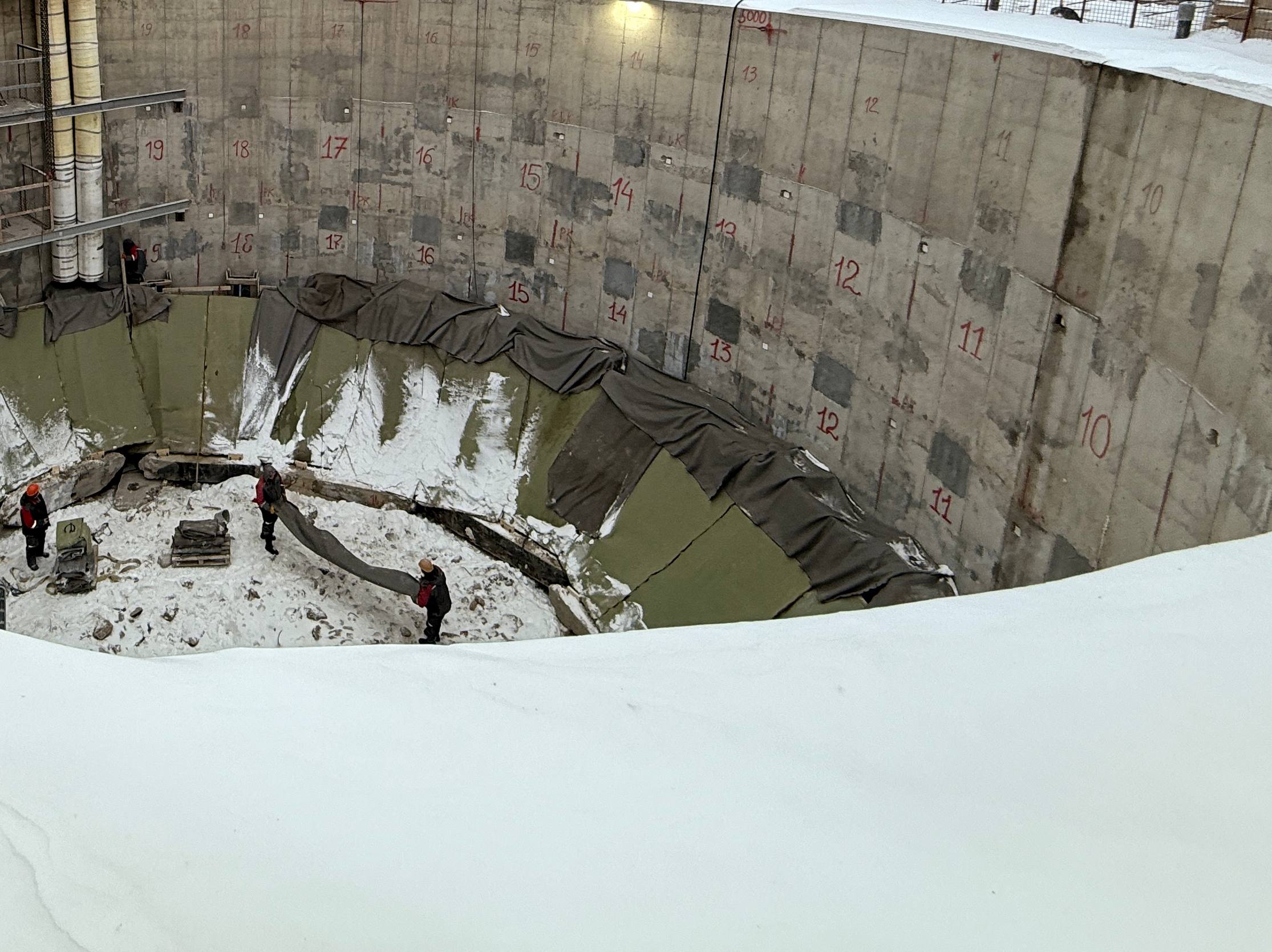 Сделано 76 проектных буросекущих свай. Идут работы по разработке грунта внутри котлована, его глубина составит ~ 35 метров. Выполнено армирование и бетонирование обвязочной балки по периметру котлована и четвёртой захватки из двенадцати. Сейчас глубина котлована ~ 12 метров. После разработки грунта бетонируется внутренняя стена по контуру свай.