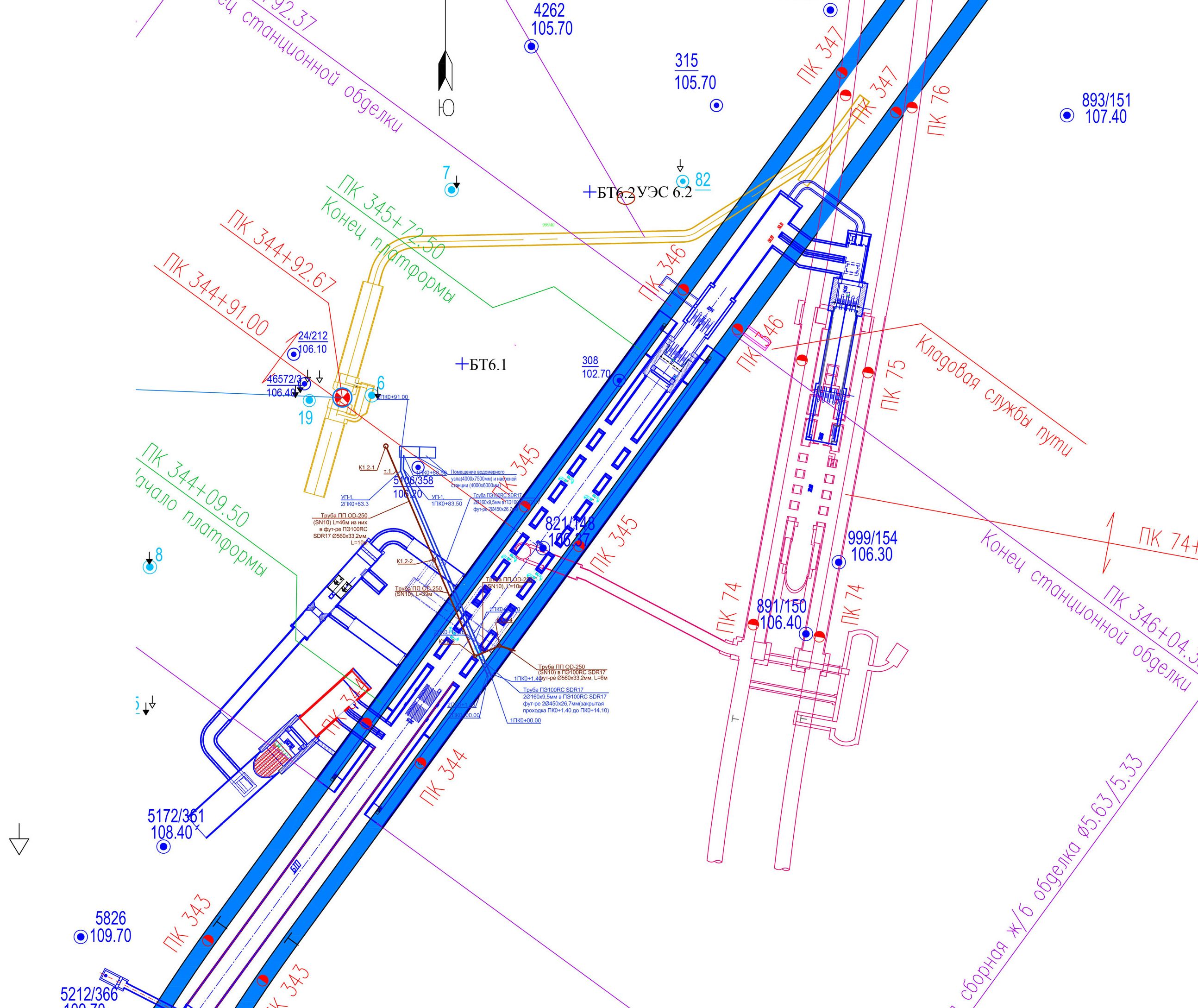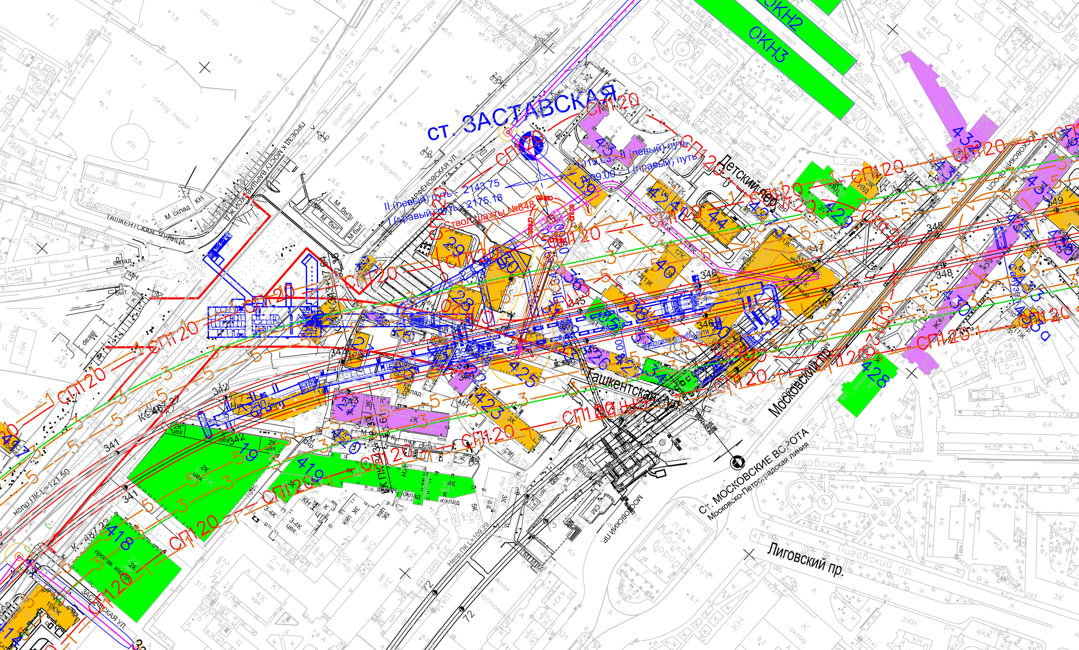 планировка станционного комплекса Заставской и пересадочного узла до Московских ворот. Удивительно, но в нём исключены лестничные марши. Как видим, как и на всём втором участке ККл, увеличили количество проходов до десяти в каждый БСТ.