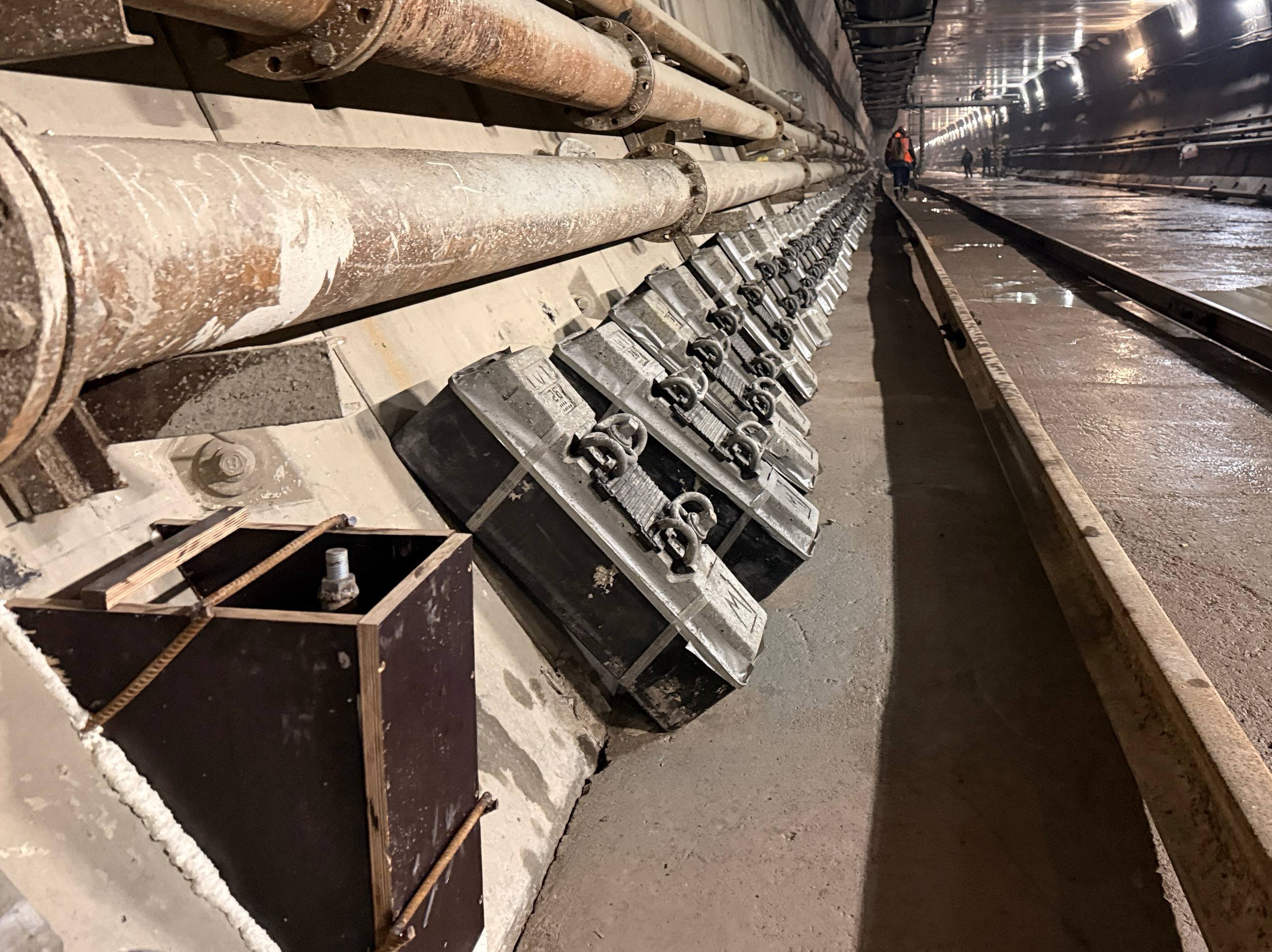 Параллельно на новом участке Невско-Василеострвоской линии метростроители возводят плиту вентиляционного перекрытия и сооружают жесткое основание тоннеля.