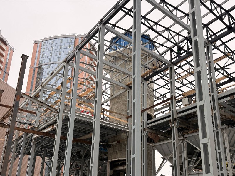 Полным ходом идёт оборудование горного комплекса. Установлены все несущие опоры и горизонтальные балки перекрытий, подвешены 4 бункера-накопителя для грунта. Ведётся наладка подъёмной машины.