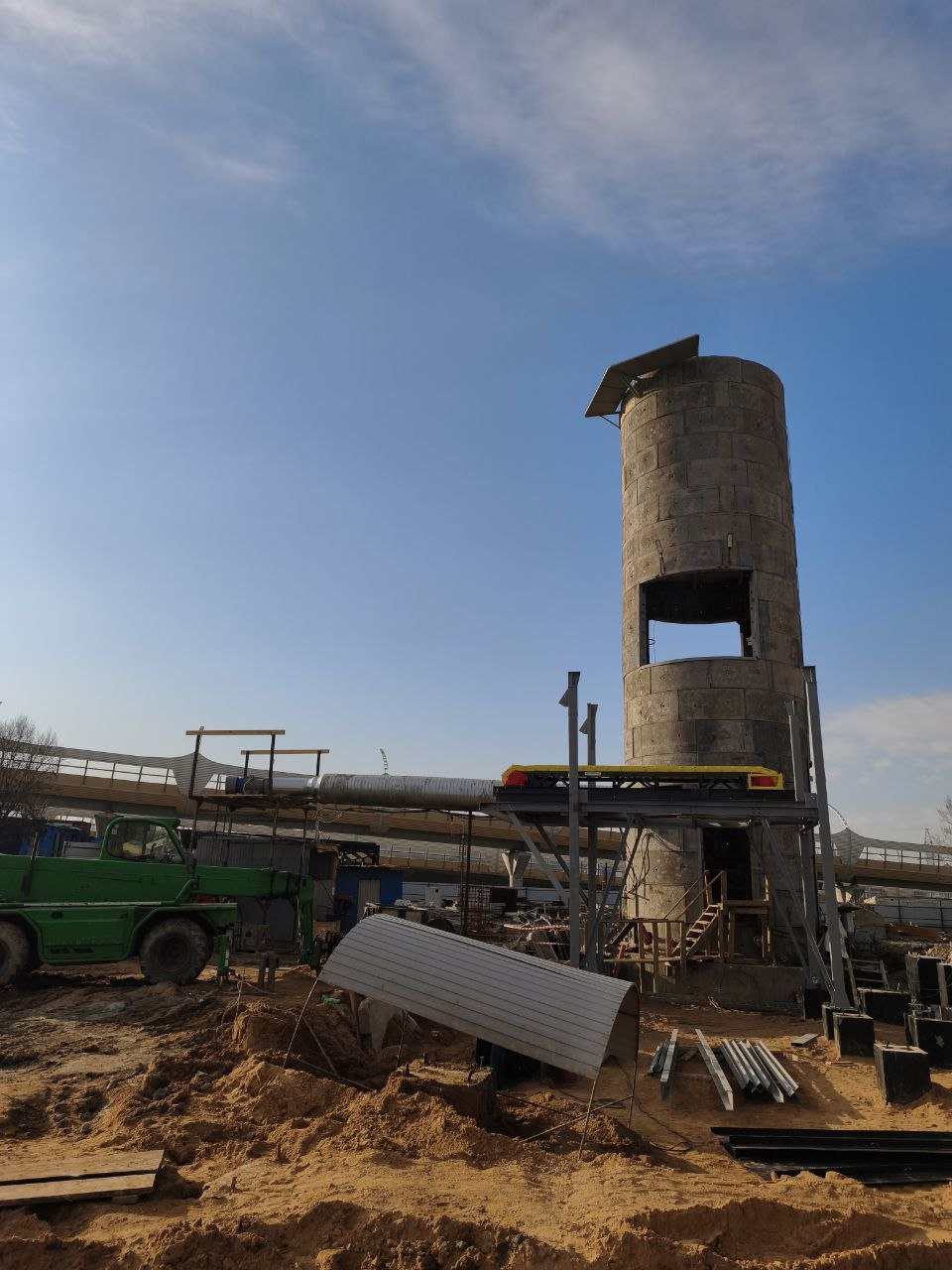 Полным ходом идёт оборудование горного комплекса. Установлены все несущие опоры и горизонтальные балки перекрытий, подвешены 4 бункера-накопителя для грунта. Ведётся наладка подъёмной машины.