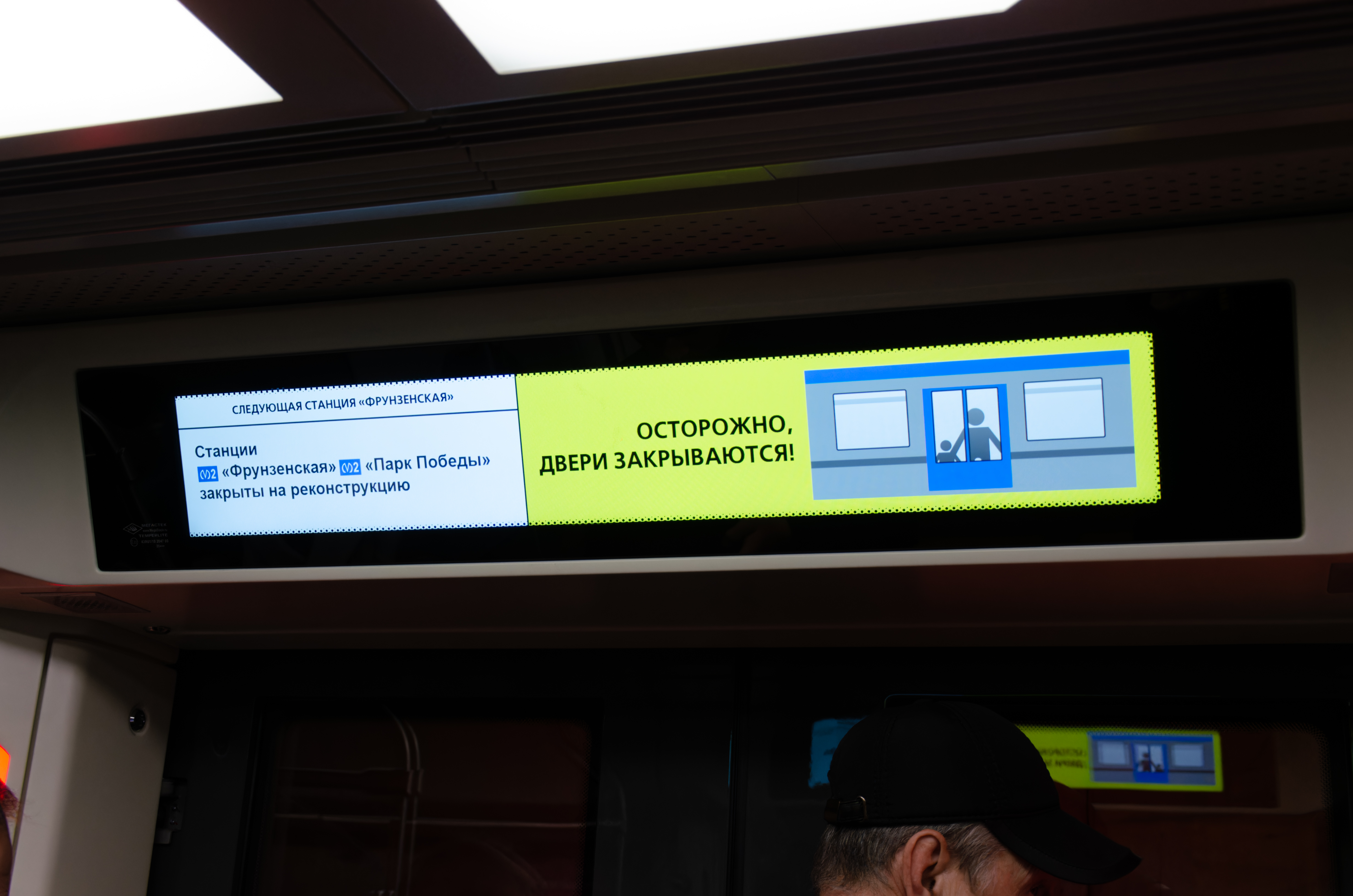 Ладно, спустя почти месяц после начала эксплуатации синих, я закину, как выглядят информационные табло в первом Балтийце (25087 - 25088). К слову, этот экран в окне снимут в начале июня в связи с проведением испытаний, как этот экран может эксплуатироваться на территории Петербургского метрополитена.