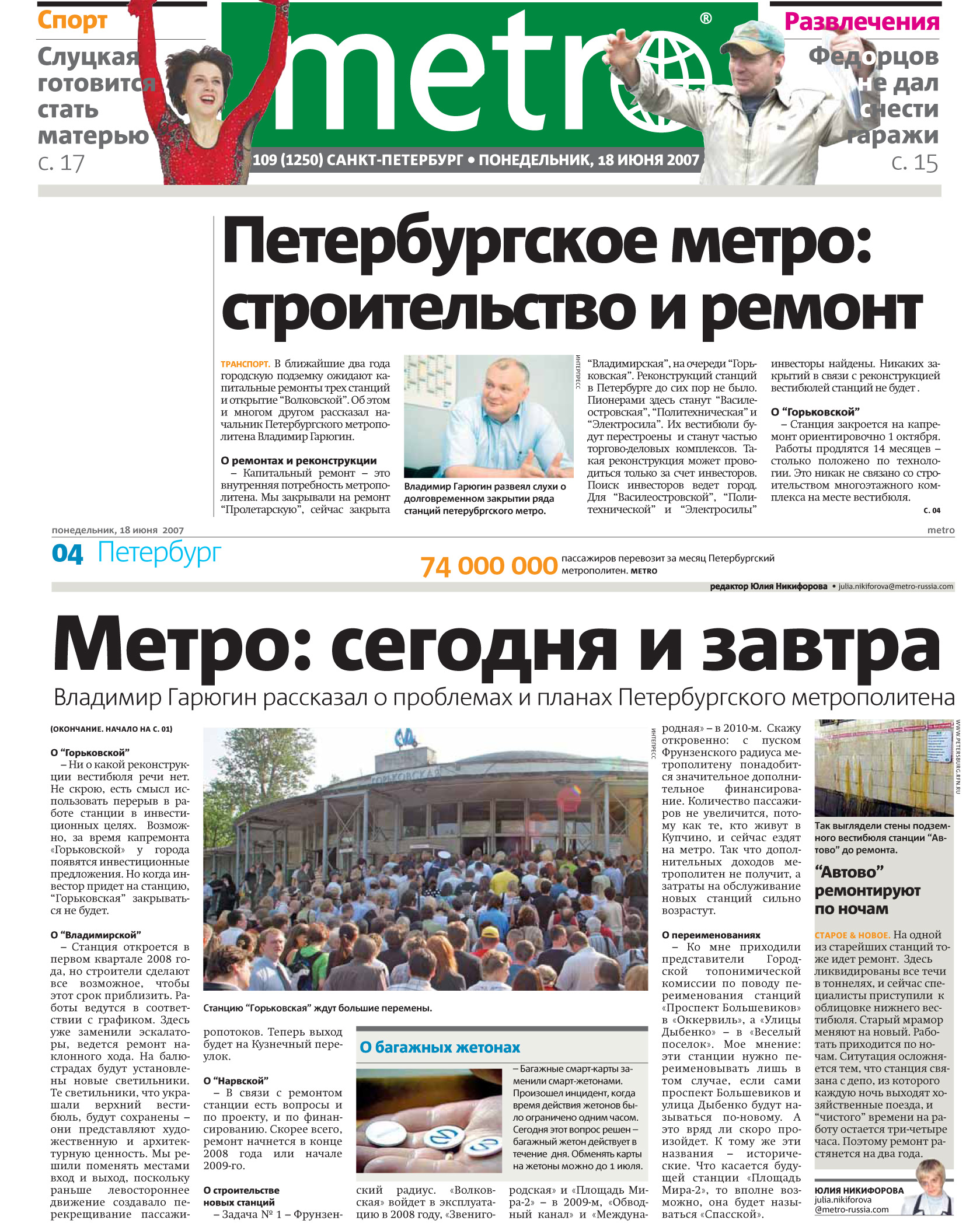 А вот статья из газеты Метро по мотивам пресс-конференции. Удивила фраза о сдаче "Пл.Мира-2" в 2009г. Очевидно, что речь идет о наклоннике. Но ведь его явно не успеют в 2009 сделать. Очередной ляп журналистов или Гарюгина? Или что?? Может Paruv в курсе?