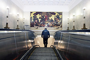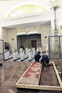Гранит стен вестибюля надраен до зеркального блеска. Колонны, стены кассового зала сияют как новые, и, лишь внимательно всмотревшись в разноцветье мрамора, можно заметить тонюсенькие нити стыков.