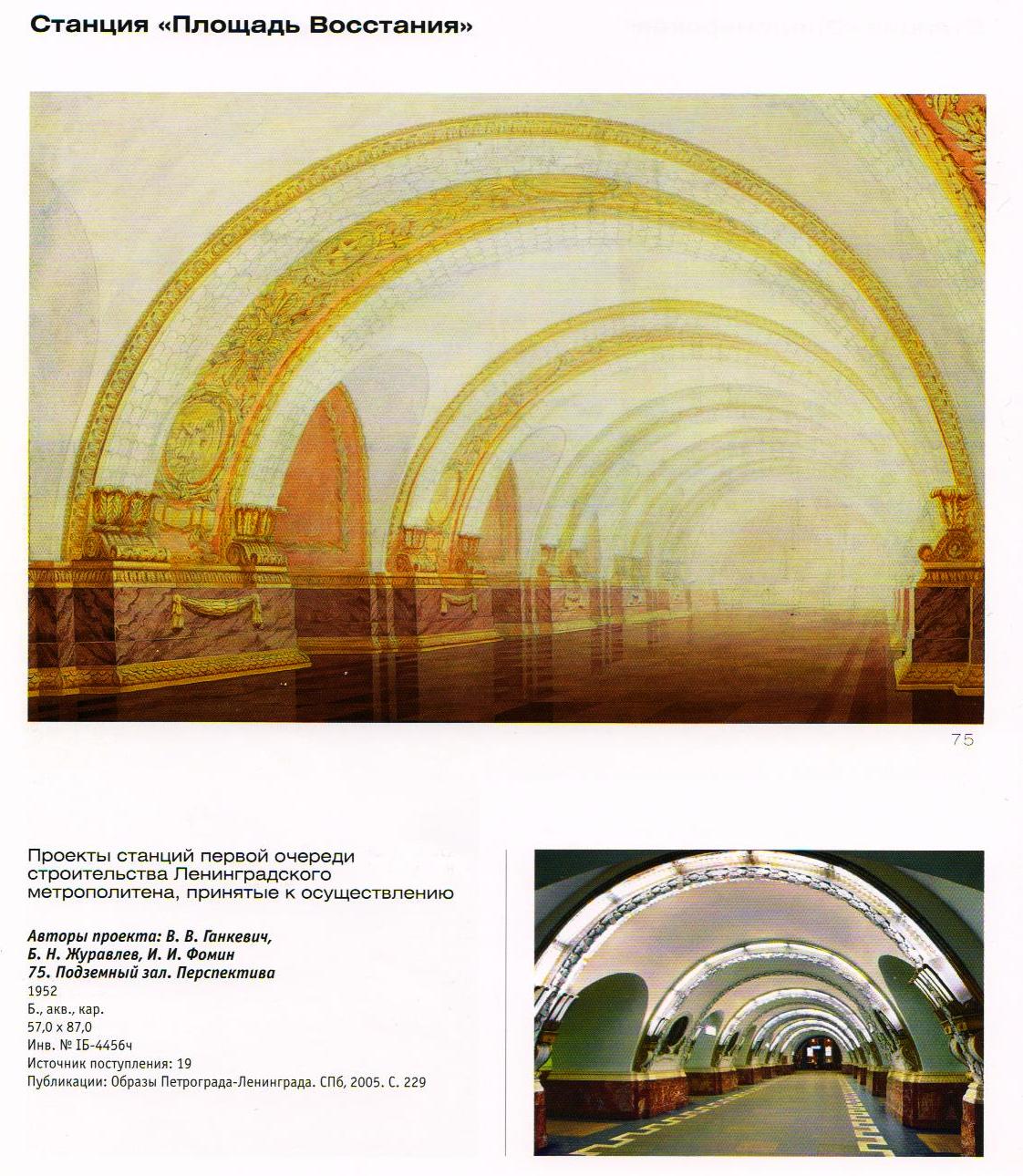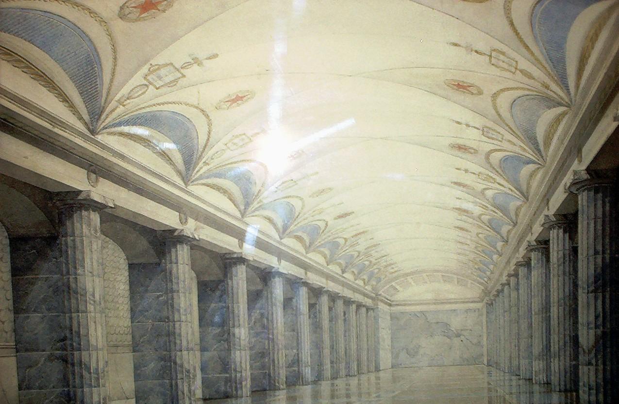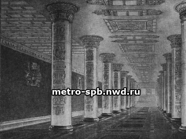 Станция пилонного типа Отделка пилон темно-красный мрамор , на стенах золотые подсветчники, пол темно бурый гранит. В книге фотка черно-белая я видел ее цветную, по памяти отобразил. Неосуществленный проект.